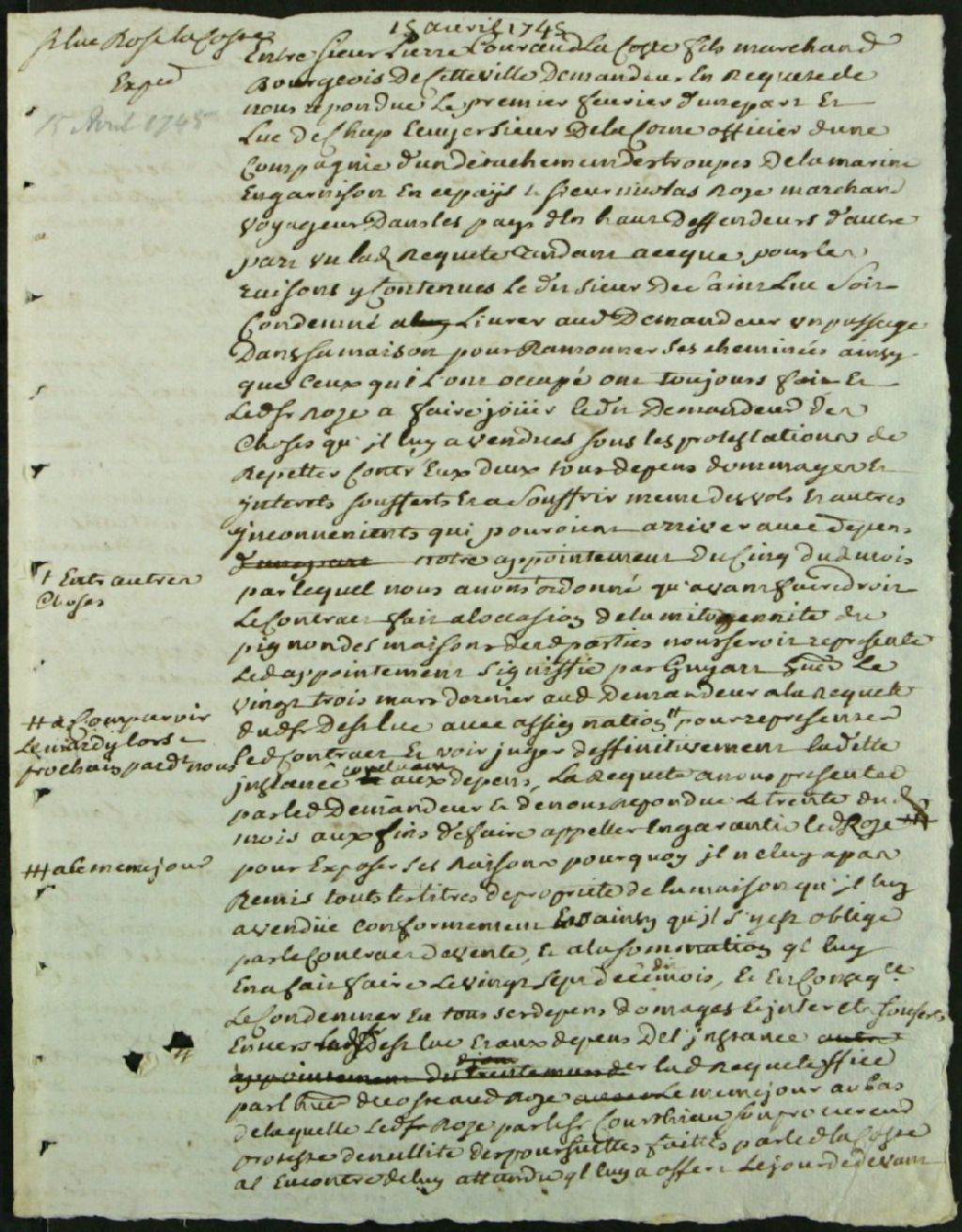 Ce dossier de matière civile est composé du brouillon d'une sentence qui déboute Pierre Courault dit Lacoste, fils, de ses prétentions contre son voisin, Luc de Lacorne, et le condamne à payer la moitié des frais de réparations d'un pignon mitoyen entre les bâtiments des parties. Nicolas Rose, voyageur des pays d'en haut, est mentionné comme tierce partie dans ce document