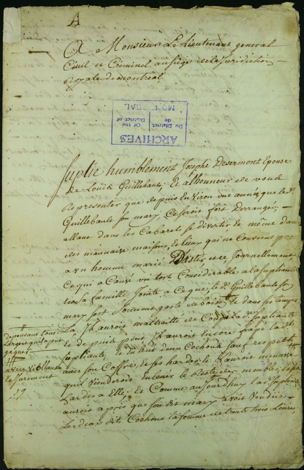 - Ce dossier de matière civile est composé des pièces suivantes : la requête en séparation de biens de Marie-Josèphe Demers, épouse de Louis Guilbault, pour mauvaise conduite, mauvaise gestion de ses affaires et boisson ; la requête en signification à partie ; l'ordonnance pour faire assigner les témoins de Marie-Josèphe Demers qui sont Jean-Baptiste Barsalou, 39 ans, tanneur, de Côte-Ste-Catherine et Louis Mallet, 50 ans, marchand tanneur ; le jugement par défaut contre Guilbault ; la transcription du procès-verbal d'enquête ; l'enquête au cours de laquelle les témoins de Demers font leur déposition ; la requête de Demers pour faire assigner son mari pour qu'il produise les pièces dont il veut se servir au procès ; la sentence de défaut pour non comparution de Guilbault ; l'inventaire des pièces produites par Marie-Josèphe Demers, marquées de A à J ; et la signification