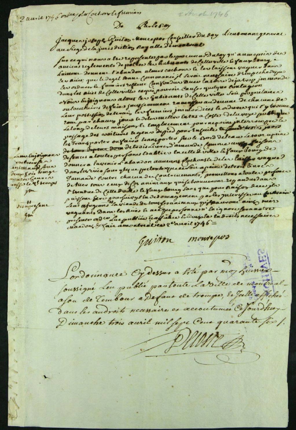 Ordonnance pour l'enlèvement du fumier et des immondices devant les emplacements des habitants de Montréal, 2 avril 1746, Archives nationales à Montréal, Fonds Juridiction royale de Montréal, (06M,TL4,S1,D5217).