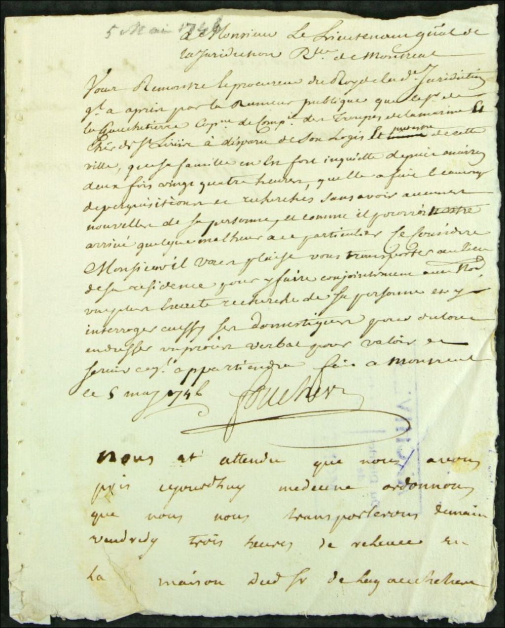 - Ce dossier d'administration judiciaire est composé des pièces suivantes : le réquisitoire du procureur du roi adressé au lieutenant général afin qu'il aille à la résidence de Daniel Migeon faire enquête au sujet de sa disparition ; la note du lieutenant général, disant avoir " pris médecine " et qu'il s'y rendra le lendemain ; le procès-verbal de la descente et des recherches faites au domicile de Migeon ; les interrogatoires de Louis Larue dit St-Louis, 45 ans, caporal de La Gauchetière, engagé par de Lignery et de Marie-Josèphe Dubé, femme de Frédéric Lemont, engagée de La Gauchetière pour faire le ménage, lesquels affirment que Migeon serait disparu tôt le matin, en se rendant aux offices religieux ; le procès-verbal de la visite sur les lieux de la découverte d'un corps échoué sur la berge du fleuve, vis-à-vis la Pointe-aux-Trembles. Le noyé est " visité " par le chirurgien Feltz, lequel n'y trouve aucune trace de blessure. On [...]