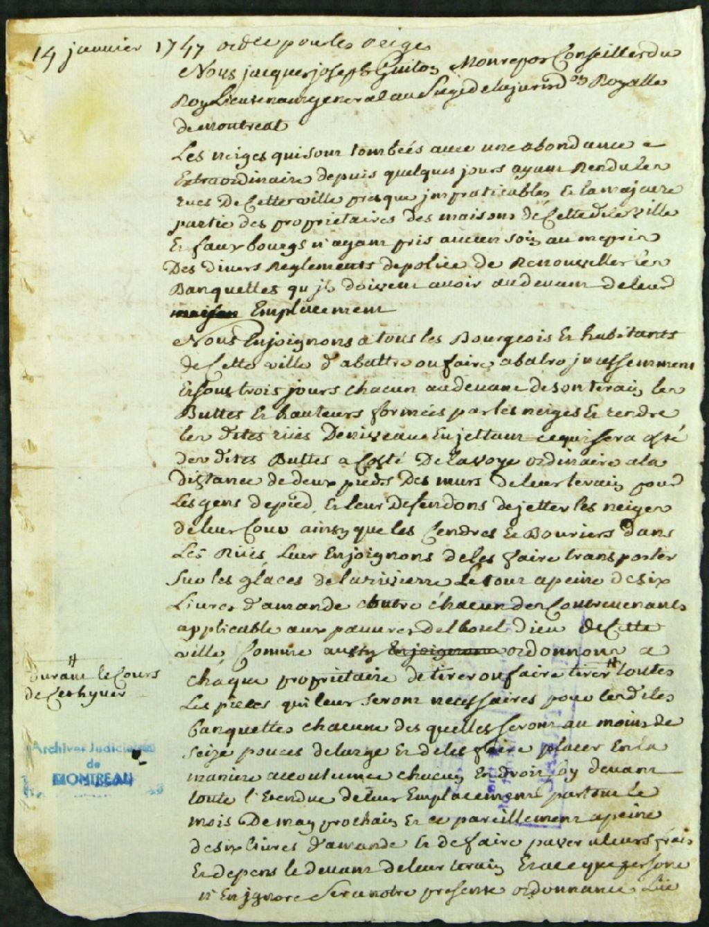 - Ce dossier d'administration civile est composé des pièces suivantes : l'ordonnance par le lieutenant général pour l'enlèvement de la neige ; et le procès-verbal de la lecture de l'ordonnance à travers toute la ville