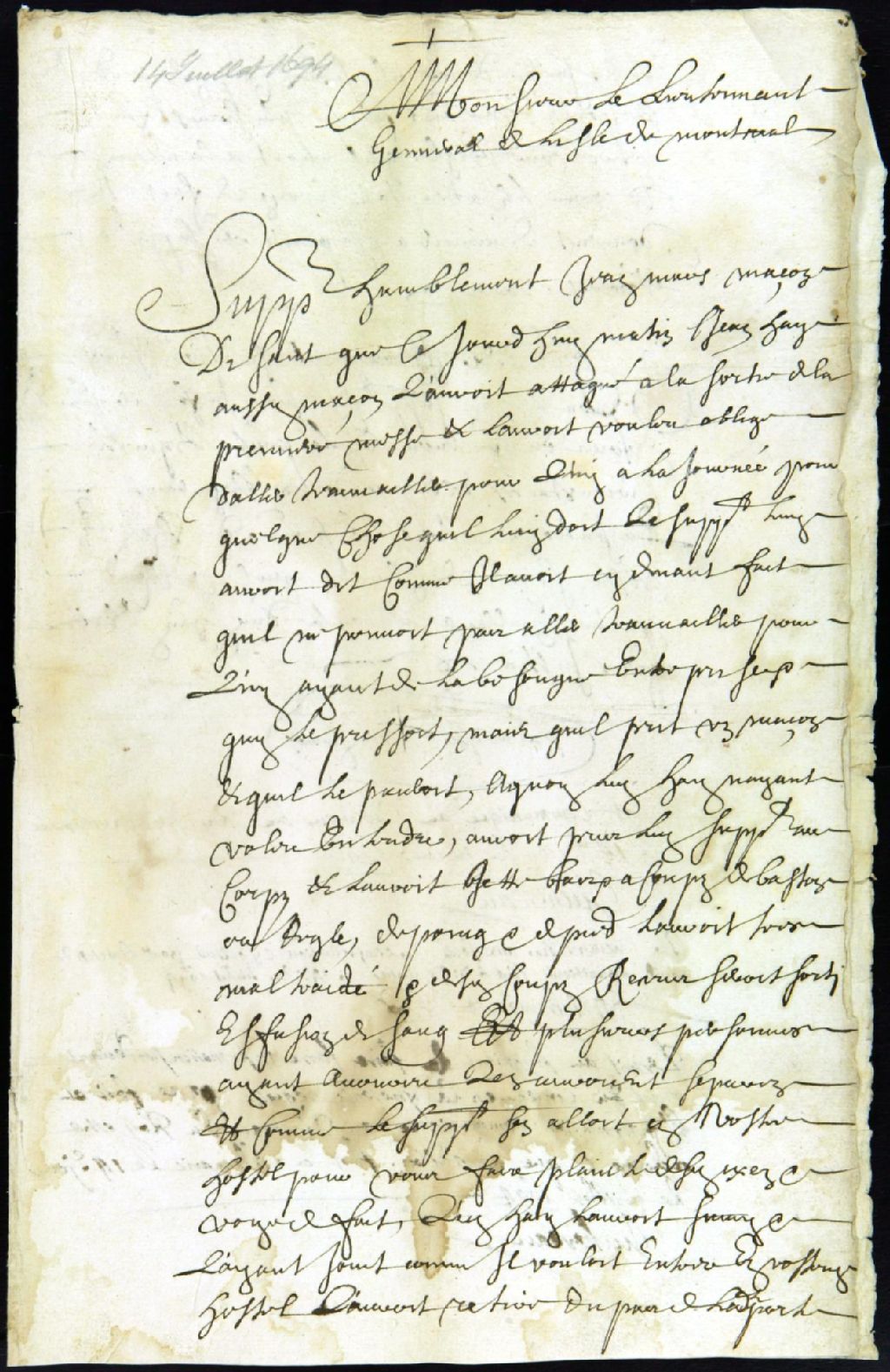 - Ce dossier de matière criminelle comprend les pièces suivantes : la requête contenant une plainte de Jean Mars, maçon, demandant une enquête contre Jean Hay pour voies de fait au sortir de la messe ; la communication au procureur du roi, lequel requiert enquête ; la permission de faire enquête ; l'ordre d'assigner les témoins dans cette cause ; l'assignation aux différents témoins ; les dépositions de ces derniers : le menuisier Joseph Chevalier, Robert Cavelier dit Deslauriers, le maçon Jean Cousineau, le boulanger Antoine Poudret, André Forand et le maçon Pierre Gougeon ; la communication au procureur du roi, lequel requiert que Jean Hay soit assigné ; et l'ordre d'assigner à Jean Hay