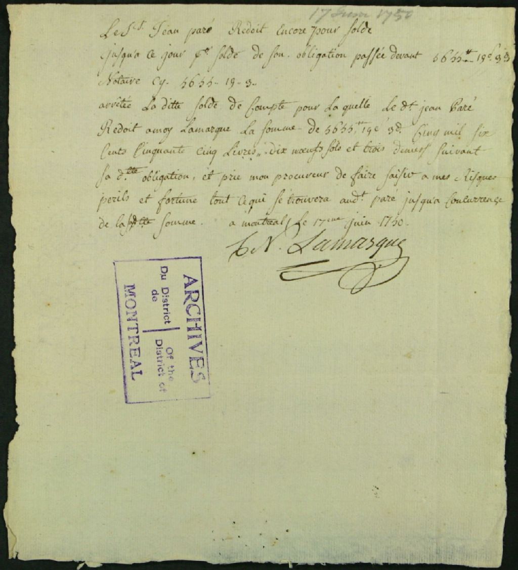 - Écrit par Charles Nolan de Lamarque à son procureur concernant les sommes dues par Jean Paré