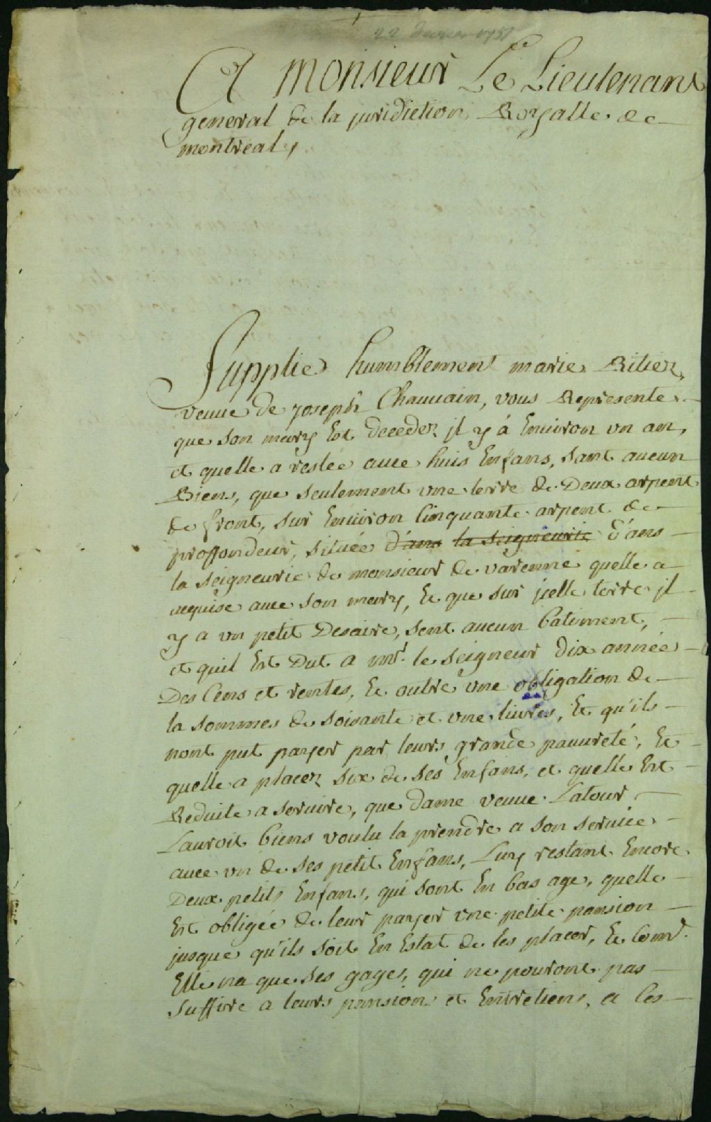 Licitation de la terre de Marie Riquet, veuve de Joseph Chauvin, 22 février 1751, Archives nationales à Montréal, Fonds Juridiction royale de Montréal, (06M,TL4,S1,D5581).