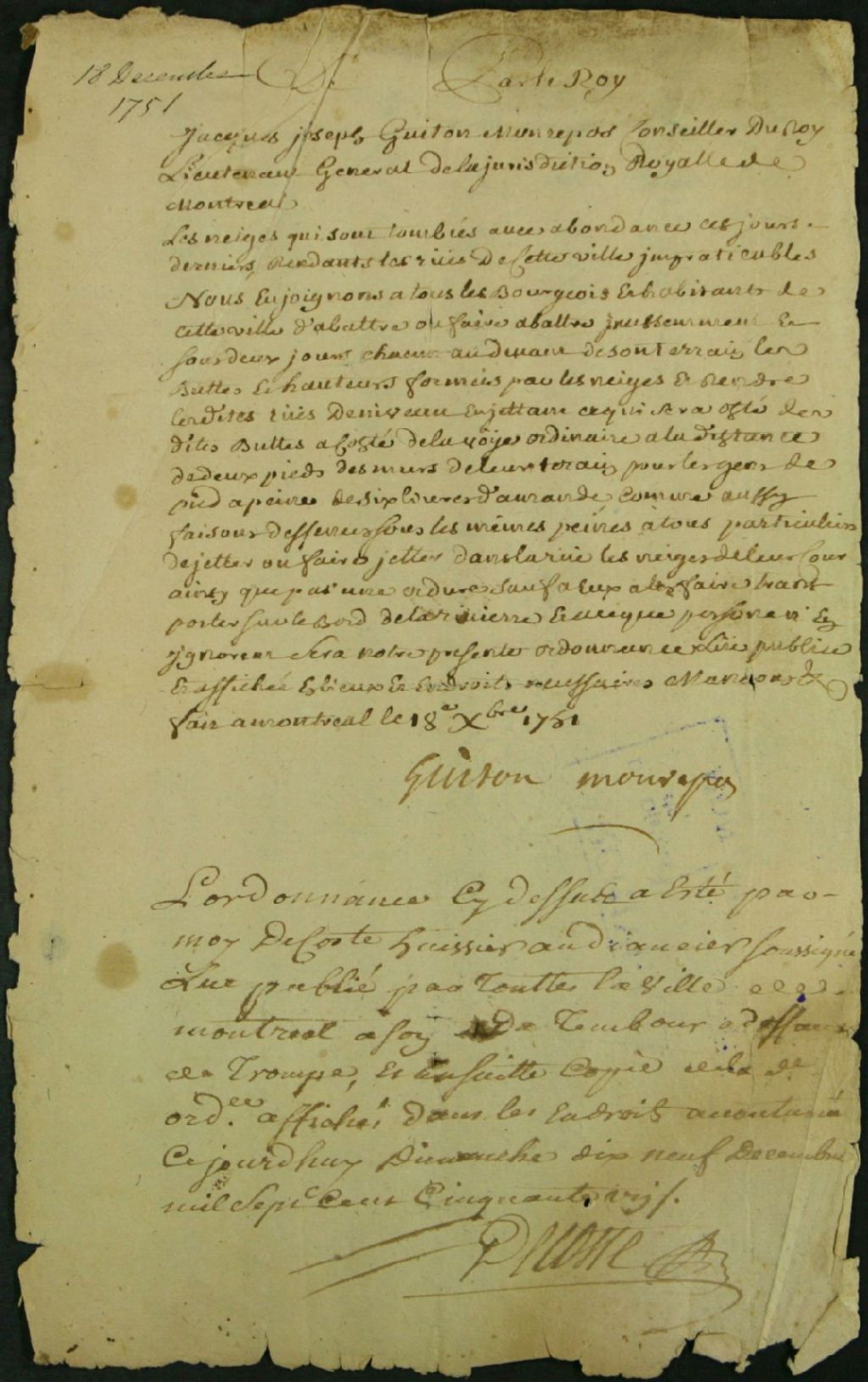 Ordonnance pour l'enlèvement de la neige, 18 décembre 1751 - 19 décembre 1751, Archives nationales à Montréal, Fonds Juridiction royale de Montréal, (06M,TL4,S1,D5659).