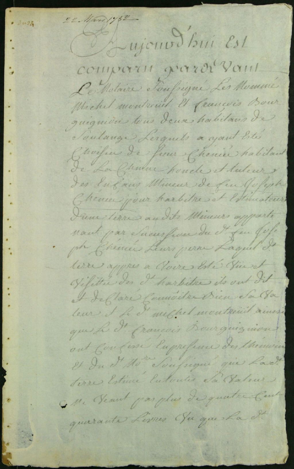 - Ce dossier d'administration judiciaire est composé du procès-verbal notarié de l'évaluation faite par les experts Michel [Montreuil?] et François Bourguignon, habitants de Soulange, de la terre appartenant aux enfants de feu Joseph Chénier, à la requête de leur tuteur