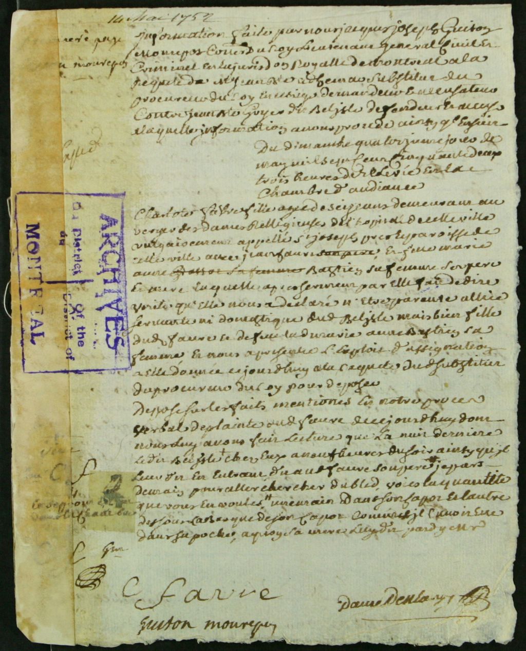 - Ce dossier de matière criminelle est d¿abord composé du procès-verbal de l'interrogatoire de Jean-Baptiste Goyer, âgé de 30 ans, lequel demeure près de la croix sur la montagne, accusé d'avoir tué Jean Favre, et sa femme, Marie Bastien, à coups de pistolet, de couteau et de bêche de jardinier, hier au cours de la soirée. Il aurait été cité et incriminé par la victime elle-même, peu avant sa mort. Le dossier contient ensuite : les ordonnances pour faire assigner les témoins ; les rapports d'assignations à comparaître ; les procès-verbaux de la déposition des témoins au cours de l'information judiciaire et de la remise de pièces d'exhibit par Charlotte Fabre, 16 ans, et Marie-Josèphe Fabre, 14 ans, y compris un capot de Cadix qu¿on dit appartenir à l'assassin ; les requêtes pour une information par addition, examiner le bonnet l¿accusé et pour son écrou ; le décret de prise de corps contre Goyer ; la transcription scellée du décret ; la permission pour l¿information par addition ; la requête pour faire une descente au domicile de l'accusé ; le procès-verbal de ladite descente et de l'apposition des scellés ; et les nouveaux interrogatoires de l'accusé.Le dossier contient également : le procès-verbal des dépositions des témoins lors de l'addition d'information judiciaire ; la requête de se transporter au domicile de Jacques Lécuyer, 43 ans, fermier des seigneurs, pour faire l'inventaire de deux ballots d'effets provenant de Bélisle ; le compte-rendu de l'inventaire des deux ballots ; l'ordre pour déposer le bonnet de Bélisle au greffe, alors que celui-ci déclare que le sang sur le bonnet provient de ses plaies lors de son arrestation ; la requête pour faire l'examen du puits devant la maison de l'accusé ; l'ordre de s'y transporter ; le procès-verbal du sondage par Jean-Marie Vallée dit Sansoucy et Thomas Giroux du puits dans lequel on n'a rien trouvé ; la requête pour l'interrogatoire de la femme de l'accusé, la nommée Marie-Anne Descaries, 24 ans, et pour celui du soldat de la Compagnie Boucherville nommé Jacques Mathenet, 30 ans, demeurant chez Descaries, père ; l'ordonnance pour faire le récolement du témoignage de Joseph Lamoureux dit St-Germain, 34 ans, voyageur qui est sur son départ pour les pays d'en haut ; le procès-verbal de récolement ; et la transcription scellée de l'ordonnance pour la comparution de Descaries, père et fille.Le dossier est enfin composé des pièces suivantes : la requête pour faire une information au sujet du "divertissement des meubles et effets appartenant à l'accusé, immédiatement après son arrestation" ; le procès-verbal de l'information sur le détournement des meubles de Goyer ; la requête pour faire ouïr Louis Descaries, père ; les interrogatoires de Marie-Anne Descaries, Jacques Mathenet et de ce dernier, lequel explique qu'il a fait enlever des effets de la maison de son gendre, après que la porte eut été défoncée par les soldats venus arrêter ledit Goyer, et que sa fille se fut réfugiée chez lui ; la requête pour le récolement des interrogatoires de Descaries, père et fille et de Mathenet ; l'ordre pour assigner les témoins pour le récolement de leurs témoignages et être confrontés à l'accusé ; le petit cahier des procès-verbaux des récolements des témoignages ; et les procès-verbaux des confrontations entre les témoins et l'accusé Goyer, lequel nie de s'être absenté de chez lui le soir du crime, témoins à l'appui.Les documents mentionnent les témoins suivant : Pierre Charbonneau, 55 ans, habitant chez Pierre Biron ; Jean-Baptiste Legrand, 42 ans, marchand ; Joseph Betin dit St-Joseph, 30 ans, caporal de la compagnie Raymond ; Claude Tatoul dit Brindamour, 23 ans, caporal de Boucherville ; Louis Pelletier, 42 ans, contremaître des fermes des religieuses ; Jean Paviot dit Vadeboncoeur, 25 ans, soldat de la Compagnie de Lacorne ; Pierre Biron, 62 ans, bourgeois du faubourg St-Joseph ; Lannolier dit Languedoc, 42 ans, jardinier ; Charles Durand dit Lajeunesse, 23 ans, cordier, soldat ; François Hutinet dit Coeurderoi, carreleur, soldat ; Claude Benoît, 40 ans, chirurgien de la rue St-Paul ; Julien [Lecomte dit Labatterie?], 22 ans, soldat de Lamartinière ; Jean [Lemigny dit St-Michel?], 40 ans, soldat de la Compagnie Boucherville ; Jacques [Tiesson dit Sansoucy?], 28 ans, paveur, soldat de Fonville ; Maurice Gautro dit Champagne, 28 ans, soldat de la Compagnie Fonville ; Jean Léchelle, 35 ans, marchand, bourgeois ; Marguerite Raimbault, époux de Pierre Boucher ; Pierre-Philippe de Noyelles de Fleurimont, 25 ans, cadet de Lignery ; Vital Brault dit Pomainville, 24 ans, voyageur, de Lachine ; Pierre Lebrun dit Lebrun, 30 ans, soldat de la Compagnie Boucherville ; Claude Leheu dit Latulippe, 40 ans, cordonnier ; Jeanne Boutin, 42 ans, épouse de Leheu dit Latulippe ; Jacques Mathenet, 30 ans, soldat de la Compagnie Boucherville ; Louise Raimbault, 42 ans, fille ; Marguerite Boucher de Boucherville, 14 ans ; Louis-Philippe Raimbault Mazure, 35 ans, enseigne à Louisbourg ; Joseph Raimbault Groschery, 32 ans, cadet de la Compagnie de Boucherville. Jacques Goyer dit Bélisle, époux d¿Hélène Courault, est également cité