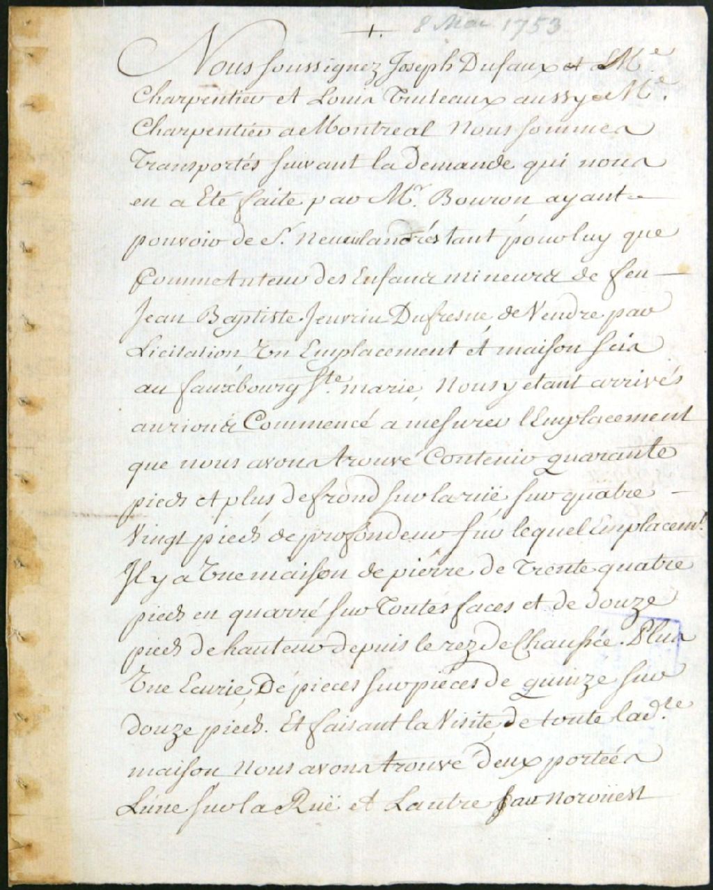 - Ce dossier d'administration judiciaire est composé des pièces suivantes : le rapport des experts Joseph Dufault et Louis Trudeau, sur la valeur de l'emplacement, de la maison de pierre et de l'écurie située au faubourg Sainte-Marie devant être vendus par licitation, appartenant aux héritiers de Jean-Baptiste Janvrin dit Dufresne, à la requête de Bouron, comme ayant le pouvoir de Neveu dit Lanoraye, tuteur ; et le rapport de l'assignation donnée à Picard, menuisier, dernier enchérisseur de la maison de Dufresne, pour être présent à la prochaine criée pour voir adjuger ledit emplacement