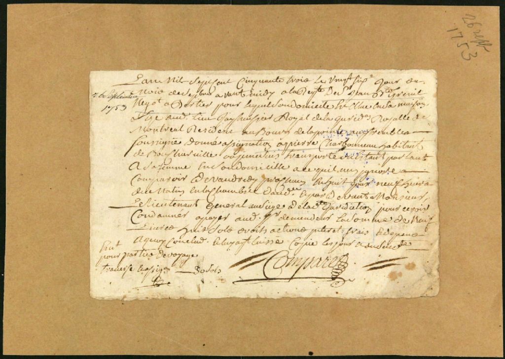 Procès entre Jean-Baptiste Greenhill, négociant à Berthier, demandeur, et Pierre Charbonneau, habitant de Boucherville, défendeur, pour le payement d'une dette, 26 septembre 1753, Archives nationales à Montréal, Fonds Juridiction royale de Montréal, (06M,TL4,S1,D5838).