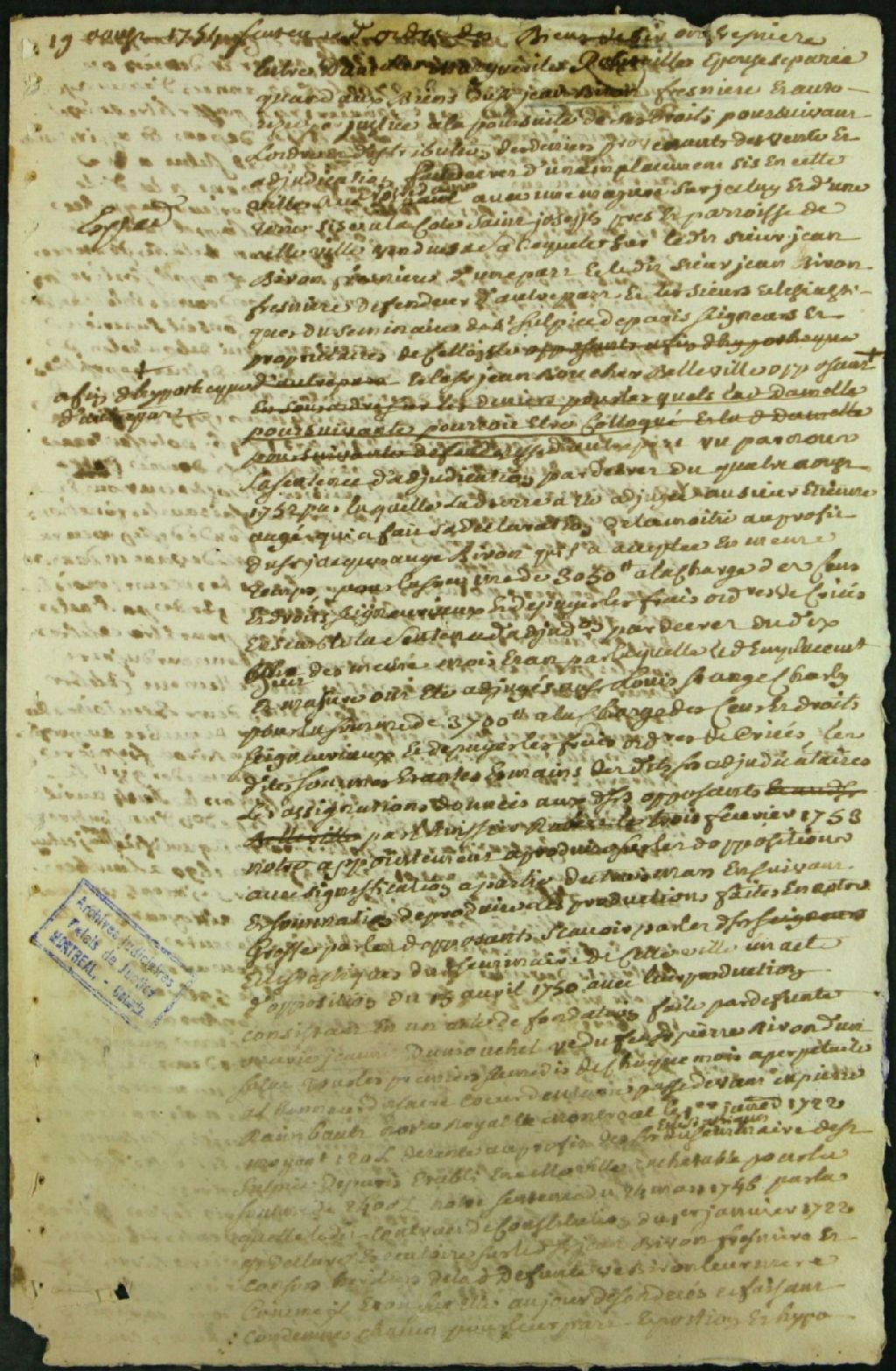 - Ce dossier de matière civile se compose des pièces suivantes : la sentence d'ordre et de distribution des deniers provenant de la vente par décret d'un emplacement et d'une masure, situés sur la rue Notre-Dame, et d'une terre à Côte-Saint-Joseph, appartenant à Jean Biron dit Fresnière, vendus à la requête de son épouse, Marguerite Robitaille ; et deux quittances. La première par le prêtre du séminaire, Jolivet, pour les seigneurs de Montréal et la seconde notariée par Pierre Panet, procureur de J.B. Boucher dit Belleville, créancier, opposant. Louis Charly Saint-Ange et Étienne Auger sont cités en tant qu'adjudicataires dans ces documents