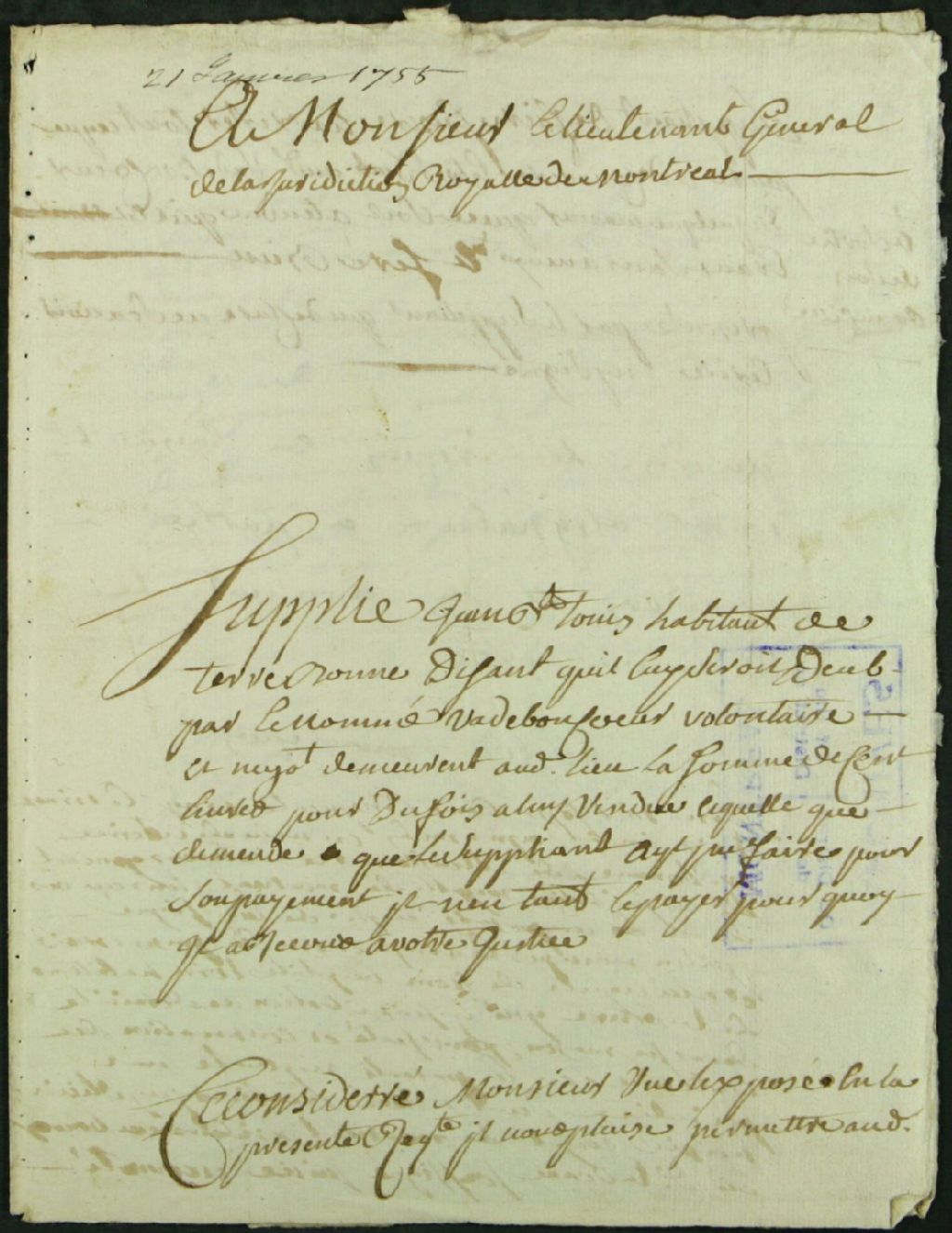 Procès entre Jean-Baptiste Thouin, habitant de Terrebonne, demandeur, et Vadeboncoeur, volontaire, négociant, défendeur, pour le paiement de fournitures de foin, 21 janvier 1755 - 17 février 1755, Archives nationales à Montréal, Fonds Juridiction royale de Montréal, (06M,TL4,S1,D5948).