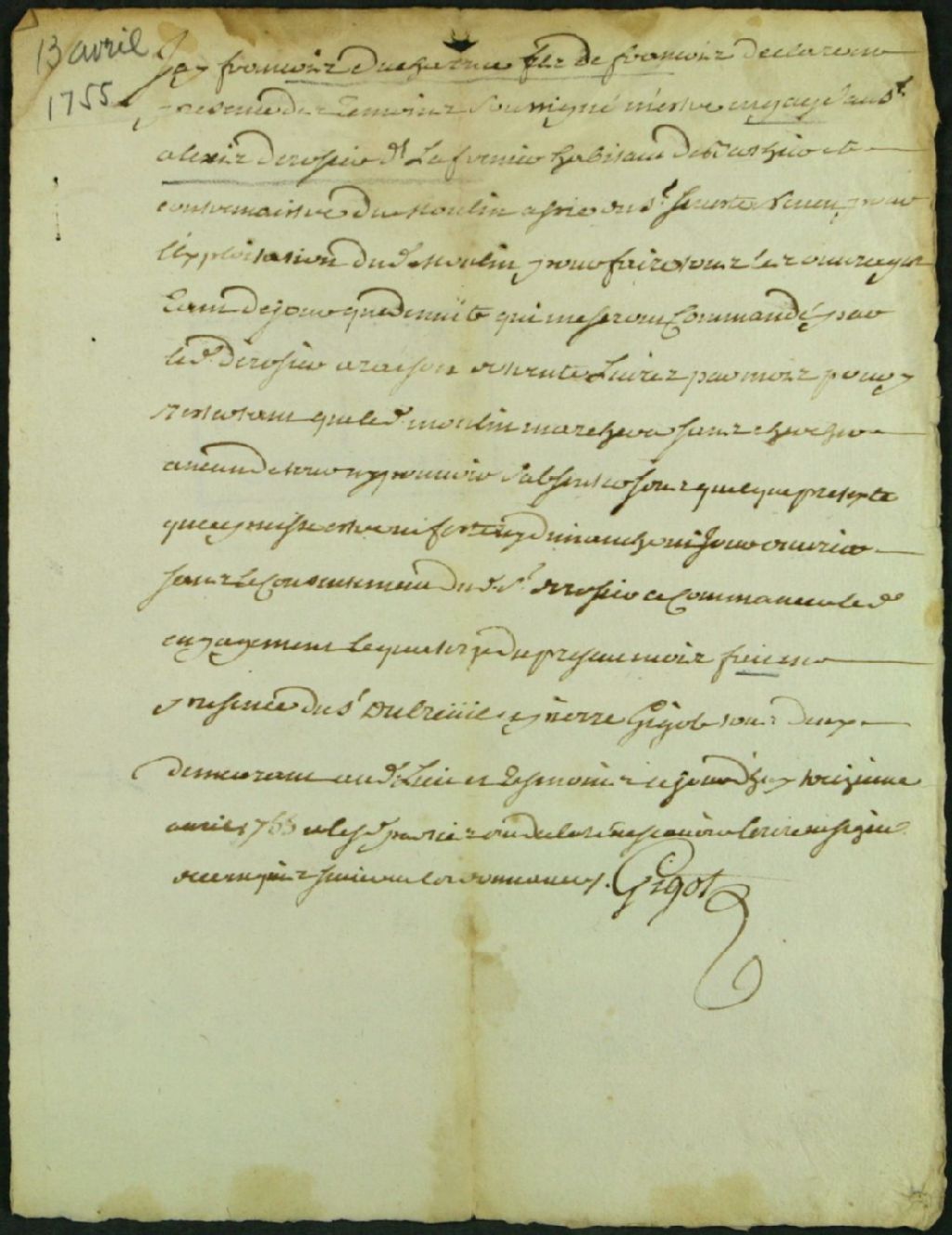 Contrat d'engagement de François Ducharme, fils, auprès d'Alexis Desrosiers dit Lafresnière, contremaître au moulin de Berthier, 13 avril 1755, Archives nationales à Montréal, Fonds Juridiction royale de Montréal, (06M,TL4,S1,D6004).