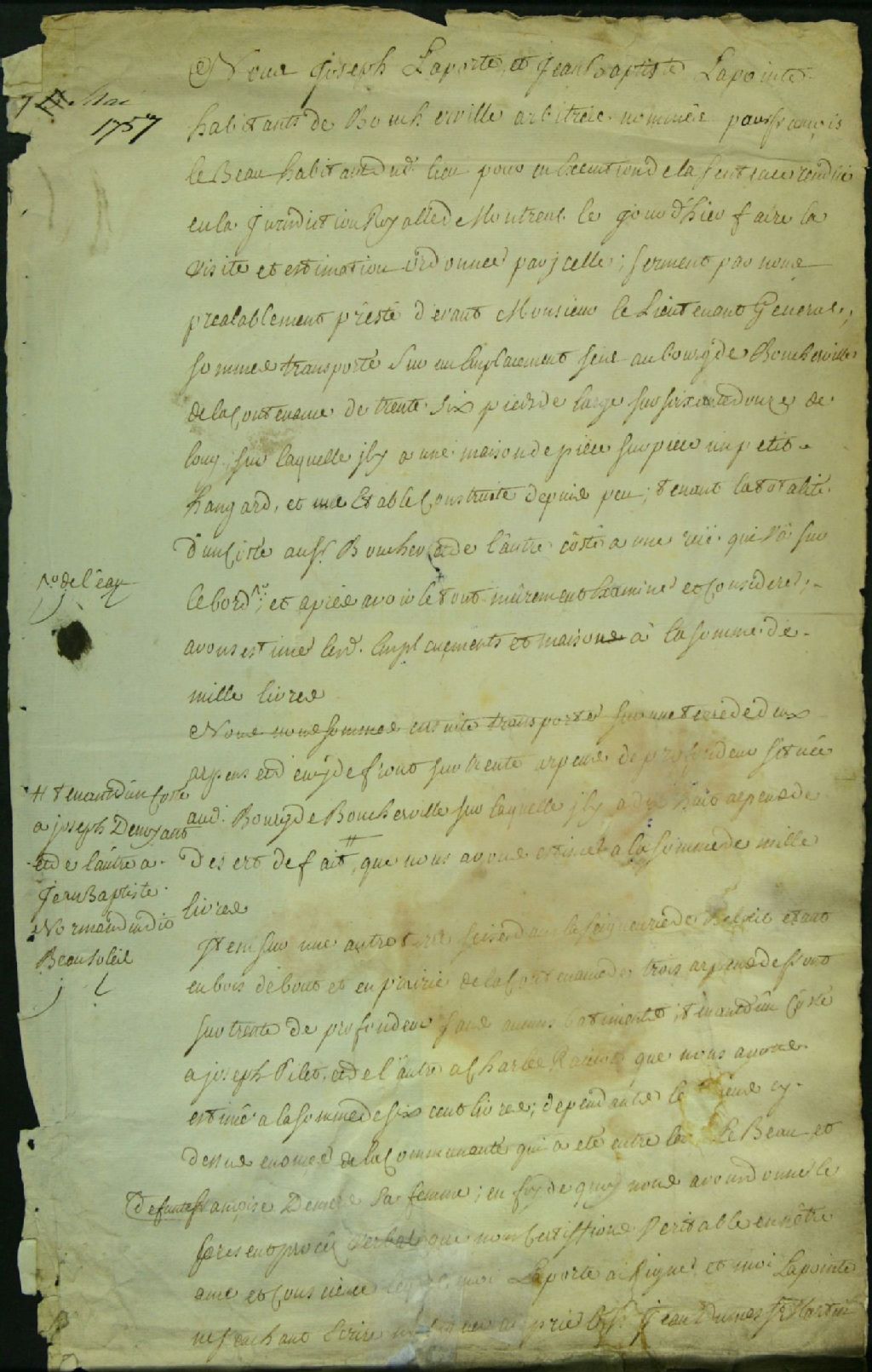 - Ce dossier de matière civile est composé du rapport des arbitres Joseph Laporte et Jean-Baptiste Lapointe nommés par François Bau, pour l'évaluation de propriétés, selon la sentence du 6 courant. Selon les arbitres, l'emplacement de Boucherville comprenant maison, hangar, étable et terre vaut 1000 livres. L'autre terre de 2 arpents par 30 de profondeur vaudrait également 1000 livres et la terre de Beloeil située entre Joseph Pilet et Charles Racicot, vaudrait 600 livres