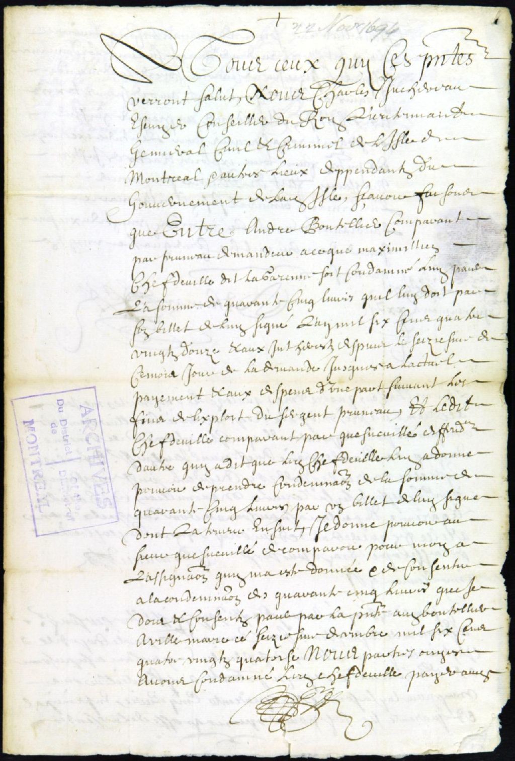 - Ce dossier de matière civile comprend la pièce suivante : la transcription certifiée du jugement rendu par Charles Juchereau pour le payement d'un billet de 45 livres, daté de l'année 1692; le rapport de signification du jugement et l'ordre de payer à Maximilien Chefdeville, rédigé par le huissier Pruneau