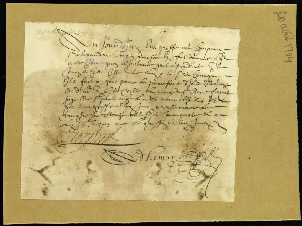 Procès entre Charles de Couagne, demandeur, et Alexandre Turpin, maître en fait d'armes, défendeur, pour un billet impayé, 20 août 1704 - 22 août 1704, Archives nationales à Montréal, Fonds Juridiction royale de Montréal, (06M,TL4,S1,D781).