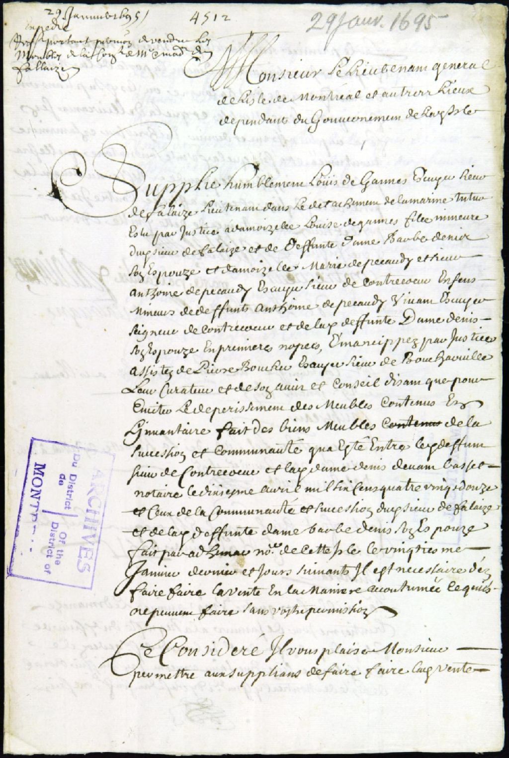 - Ce dossier d¿administration judiciaire comprend les pièces suivantes: la requête portant la permission de vendre les meubles de la succession de Barbe Denis (madame de Falaise) par Louis de Gannes, tuteur élu de Louise de Gannes et de Marie Pécaudy de Contrecoeur, émancipée par justice, assistée de Pierre Boucher, curateur. On y trouve aussi la communication au procureur du roi et l¿accord, de même que l¿accord du lieutenant général Charles Juchereau; le rapport d'affiches par le huissier Georges Pruneau