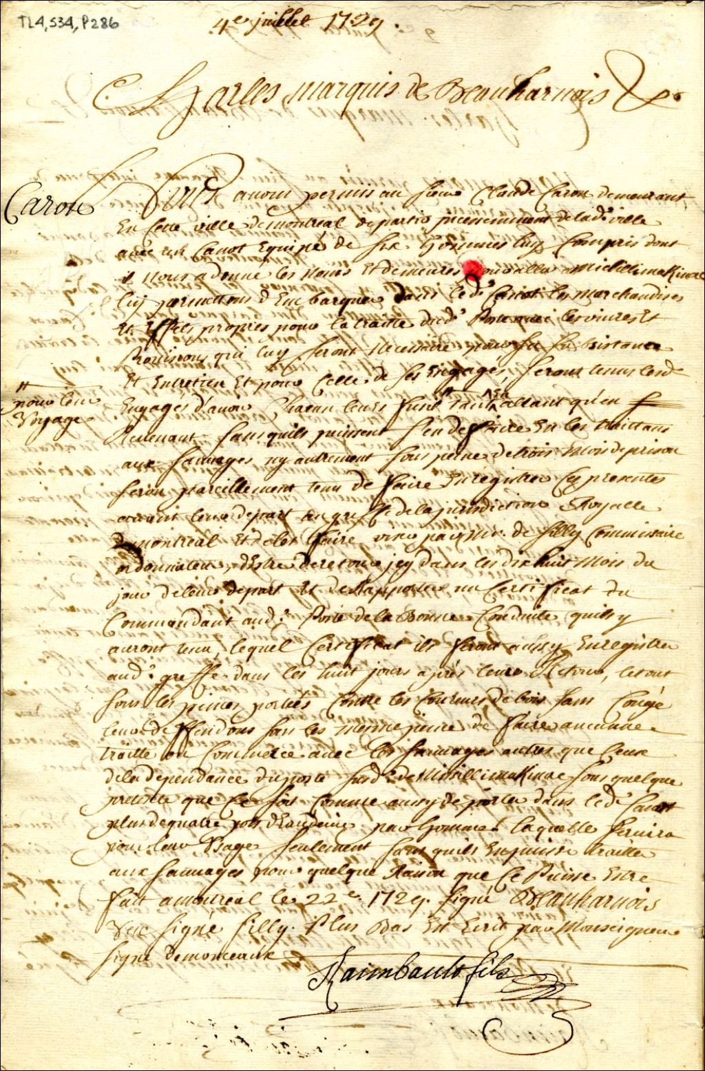 Montréal. Enregistrement d'une permission accordée par Charles de Beauharnois, gouverneur de la Nouvelle-France, du 22 juin, à Claude Caron de Montréal, d'un canot et six hommes, pour aller à Michillimakinac, et emporter des marchandises pour la traite avec les Sauvages
