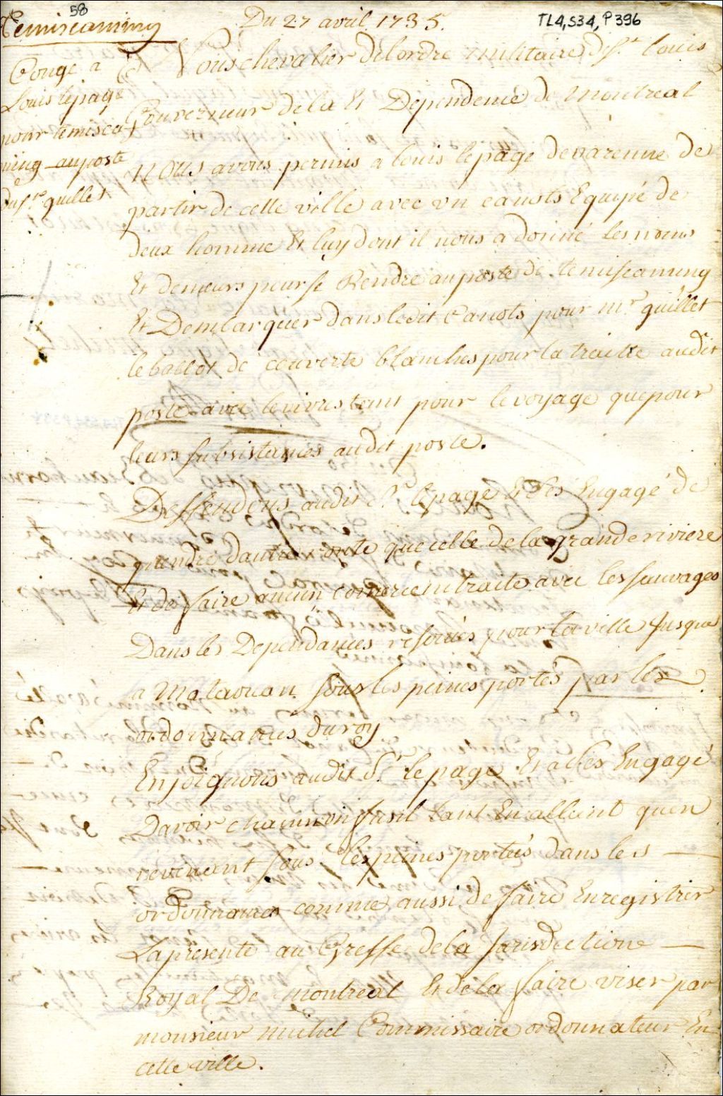 Montréal. Enregistrement d'une permission accordée par Charles de Beauharnois, gouverneur de la Nouvelle-France, à Louis Lepage, de Varennes, d'un canot et trois hommes, dont lui, pour porter à Guillet au Poste de Témiscamingue, un ballot de couvertures blanches. Devront emprunter la route de la Grande Rivière et ne pourront traiter dans les dépendances réservées pour la ville jusqu'à Mataouan, 27 avril 1735, Archives nationales à Montréal, Fonds Juridiction royale de Montréal, (06M,TL4,S34,P396).