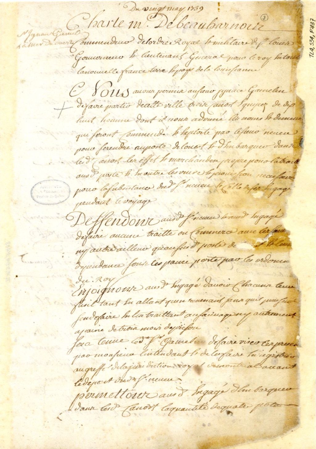 Montréal. Enregistrement d'une permission accordée par Charles de Beauharnois, gouverneur de la Nouvelle-France, à Ignace Gamelin, de trois canots et dix-huit hommes, commandé par Neveu, pour se rendre au Poste de l'Ouest