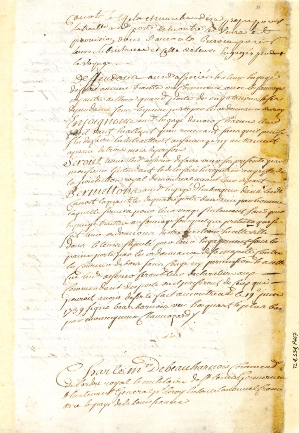 Montréal. Enregistrement d'une permission accordée par Charles de Beauharnois, gouverneur de la Nouvelle-France, le 3 juin, à Louis Auger et Jean-Baptiste Lapensée, d'un canot et cinq hommes, pour se rendre au Poste des Illinois, 22 juin 1739, Archives nationales à Montréal, Fonds Juridiction royale de Montréal, (06M,TL4,S34,P467).