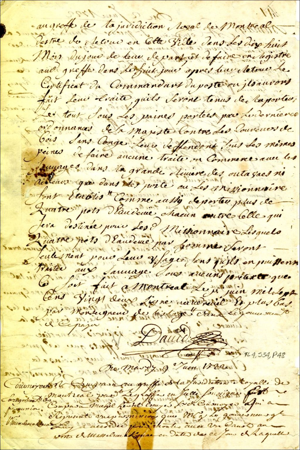 Montréal. Enregistrement d'une permission accordée par Philippe Rigaud de Vaudreuil gouverneur de la Nouvelle-France,à Michel Hertel de Cournoyer, d'un canot et quatre hommes, pour porter marchandises et munitions à la garnison et à Lambert Cournoyer [Jacques-Lambert Hertel de Cournoyer] au Poste de Michillimakinac. Ils seront tenus d'y conduire le nommé Laroche, soldat de la compagnie de Senneville, 9 juin 1722, Archives nationales à Montréal, Fonds Juridiction royale de Montréal, (06M,TL4,S34,P48).