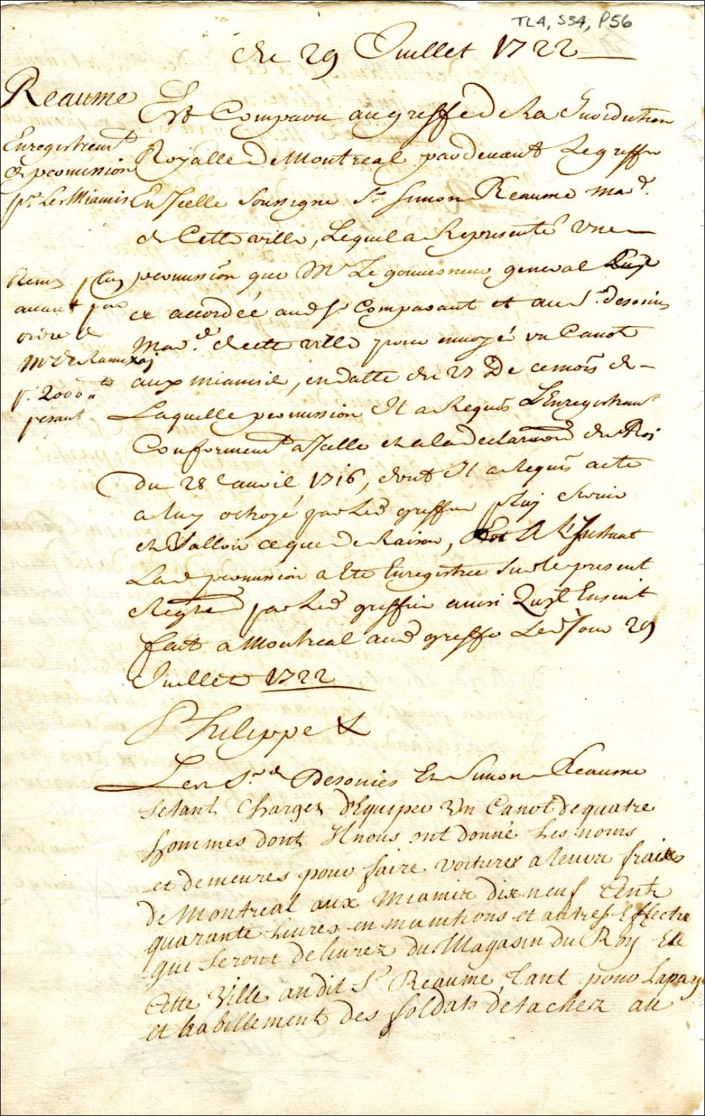 - Le dossier témoigne d'une permission, enregistrée par Simon Réaume, accordée par Philippe Rigaud de Vaudreuil gouverneur de la Nouvelle-France, le 27 juillet aux sieurs Comparant et Desoniers [Desauniers] d'un canot et quatre hommes, que Rhéaume et Desauniers équipent à leurs frais, pour livrer des munitions, des marchandises, et des présents aux Sauvages, aux postes des Miamis et des Ouyatanons, en échange de deux permissions qui leur seront accordées pour deux canots de marchandises pour faire la traite avec les Sauvages l'année prochaine.
