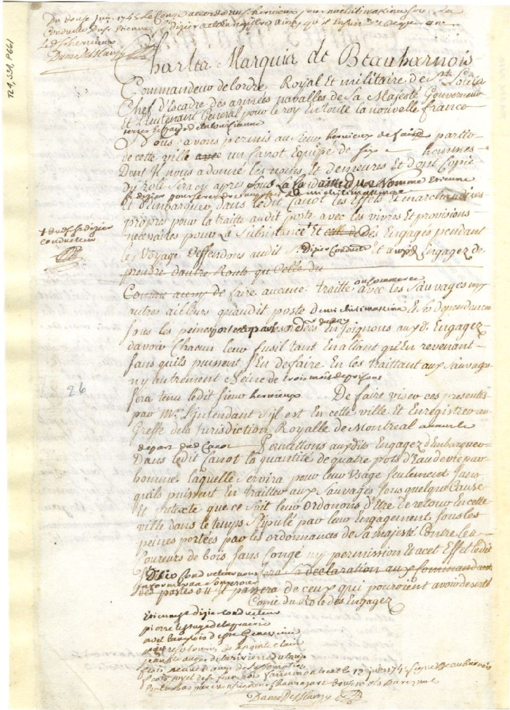Montréal. Enregistrement d'une permission accordée par Charles de Beauharnois, gouverneur de la Nouvelle-France, à Hervieux, d'un canot et six hommes, pour se rendre au Poste de Michillimakinac, 12 juin 1745, Archives nationales à Montréal, Fonds Juridiction royale de Montréal, (06M,TL4,S34,P661).