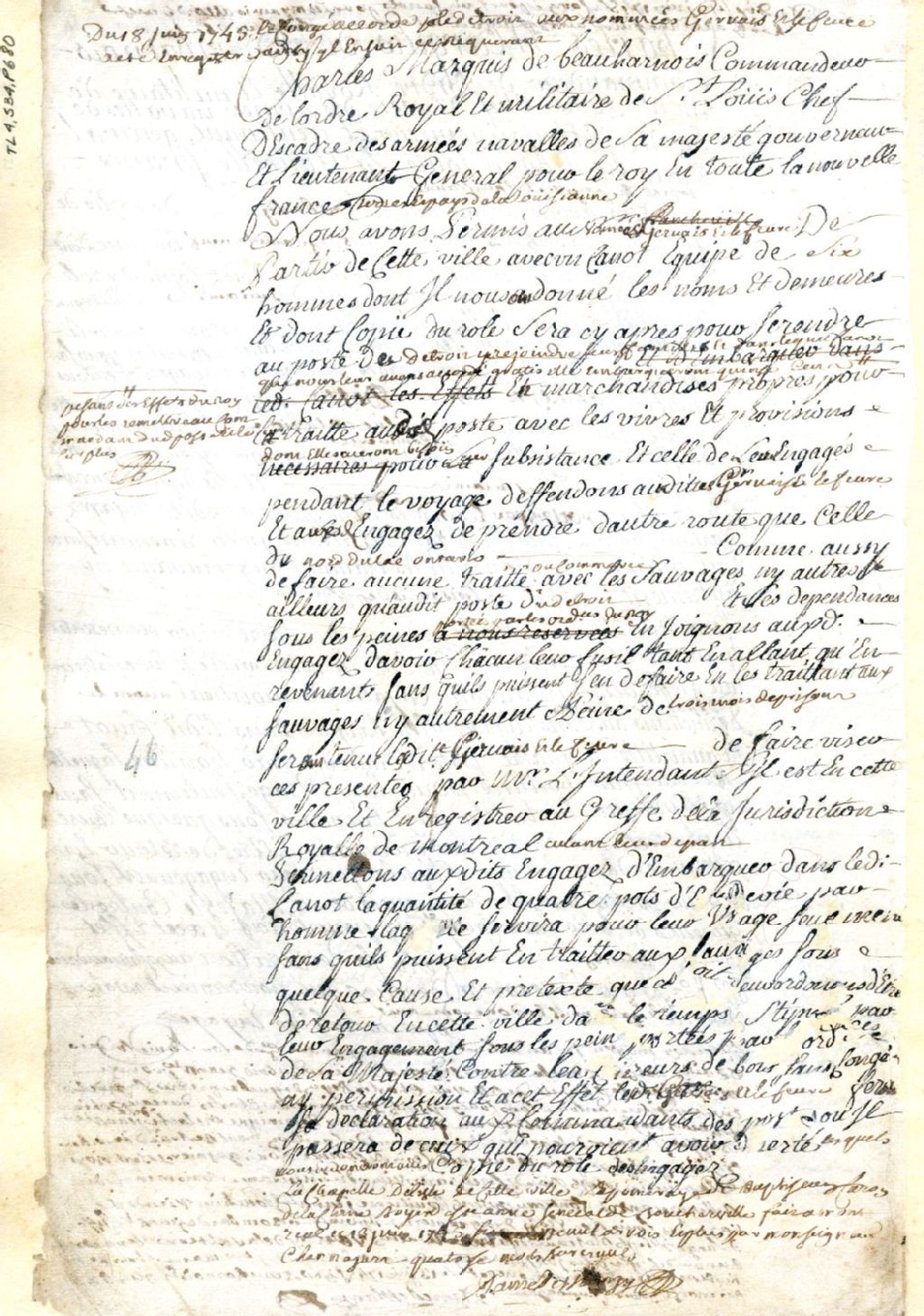 Montréal. Enregistrement d'une permission accordée par Charles de Beauharnois, gouverneur de la Nouvelle-France, le 13 juin, à Gervais et Lefebvre, d'un canot et six hommes, pour aller rejoindre leur famille au Poste de Détroit, 18 juin 1745, Archives nationales à Montréal, Fonds Juridiction royale de Montréal, (06M,TL4,S34,P680).
