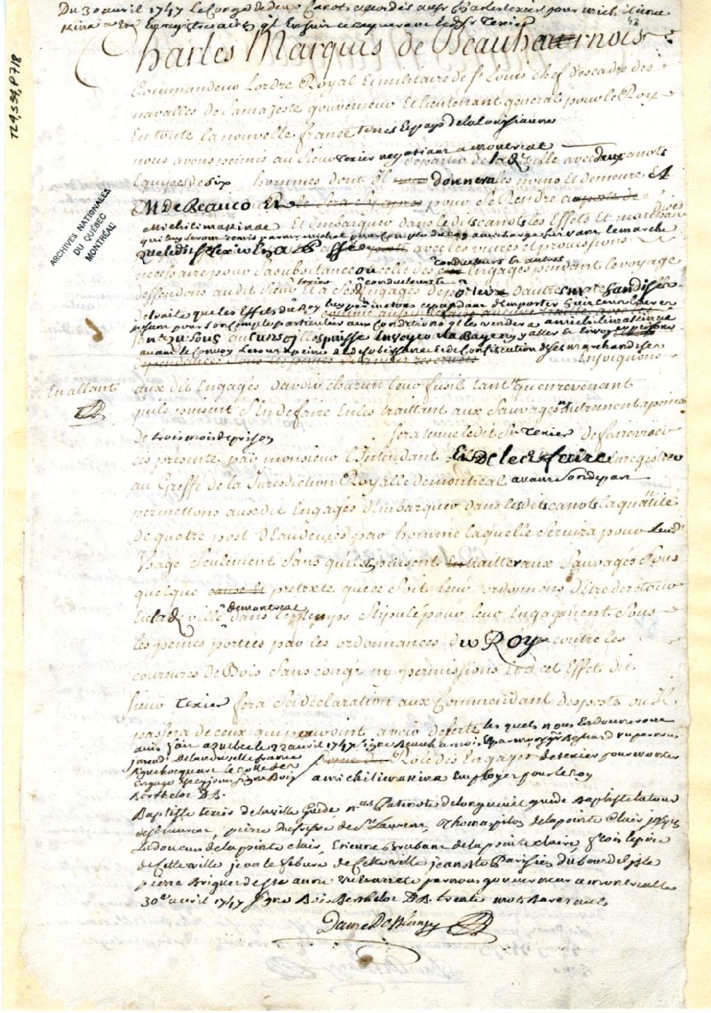 Montréal. Enregistrement d'une permission accordée par Charles de Beauharnois, gouverneur de la Nouvelle-France, à Charles Tessier, négociant, de Montréal, de deux canots et douze hommes, pour se rendre au Poste de Michillimakinac, 30 avril 1747, Archives nationales à Montréal, Fonds Juridiction royale de Montréal, (06M,TL4,S34,P718).