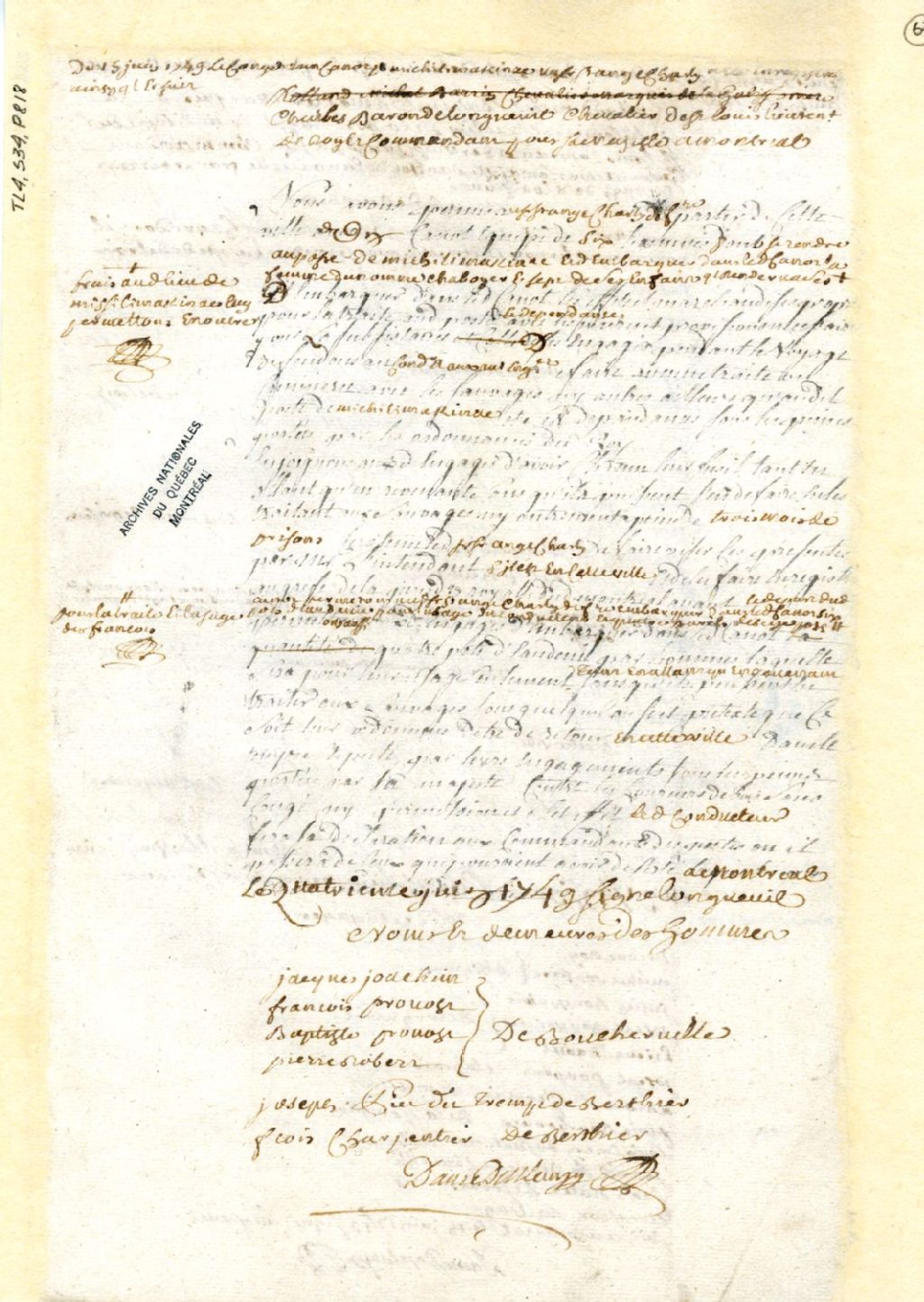 Montréal. Enregistrement d'une permission accordée par Roland-Michel Barrin de La Galissonière, commandant général de la Nouvelle-France, le 4 juin, à Saint-Ange Charly, d'un canot et six hommes, pour conduire la femme du nommé Chaboyer et sept de ses enfants au Poste de Michillimakinac, 15 juin 1749, Archives nationales à Montréal, Fonds Juridiction royale de Montréal, (06M,TL4,S34,P818).