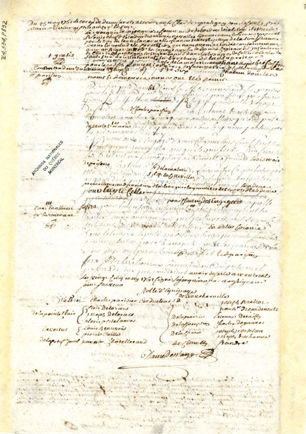 Montréal. Enregistrement d'une permission accordée par Jacques-Pierre Taffanel de la Jonquière, gouverneur de la Nouvelle-France, à [Jean-André] De Lamaletie, négociant à Québec, faisant pour De Bonne, capitaine d'infanterie et De Repentigny, enseigne en pied, concessionnaires, de deux canots et douze hommes, pour le Poste du Sault Sainte-Marie situé à l'embouchure du Lac Supérieur, 25 mai 1751, Archives nationales à Montréal, Fonds Juridiction royale de Montréal, (06M,TL4,S34,P832).
