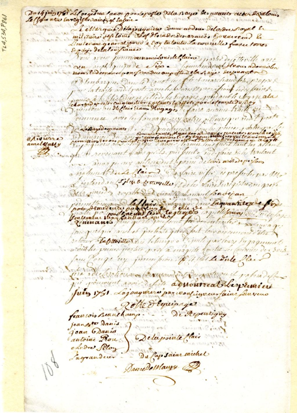 Montréal. Enregistrement d'une permission accordée par Jacques-Pierre Taffanel de la Jonquière, gouverneur de la Nouvelle-France, le 1 juin, à Louis Leclair, d'un canot et six hommes, pour se rendre au Poste de la Baie des Puants. [Green Bay, Wisconsin], 14 juin 1751, Archives nationales à Montréal, Fonds Juridiction royale de Montréal, (06M,TL4,S34,P861).