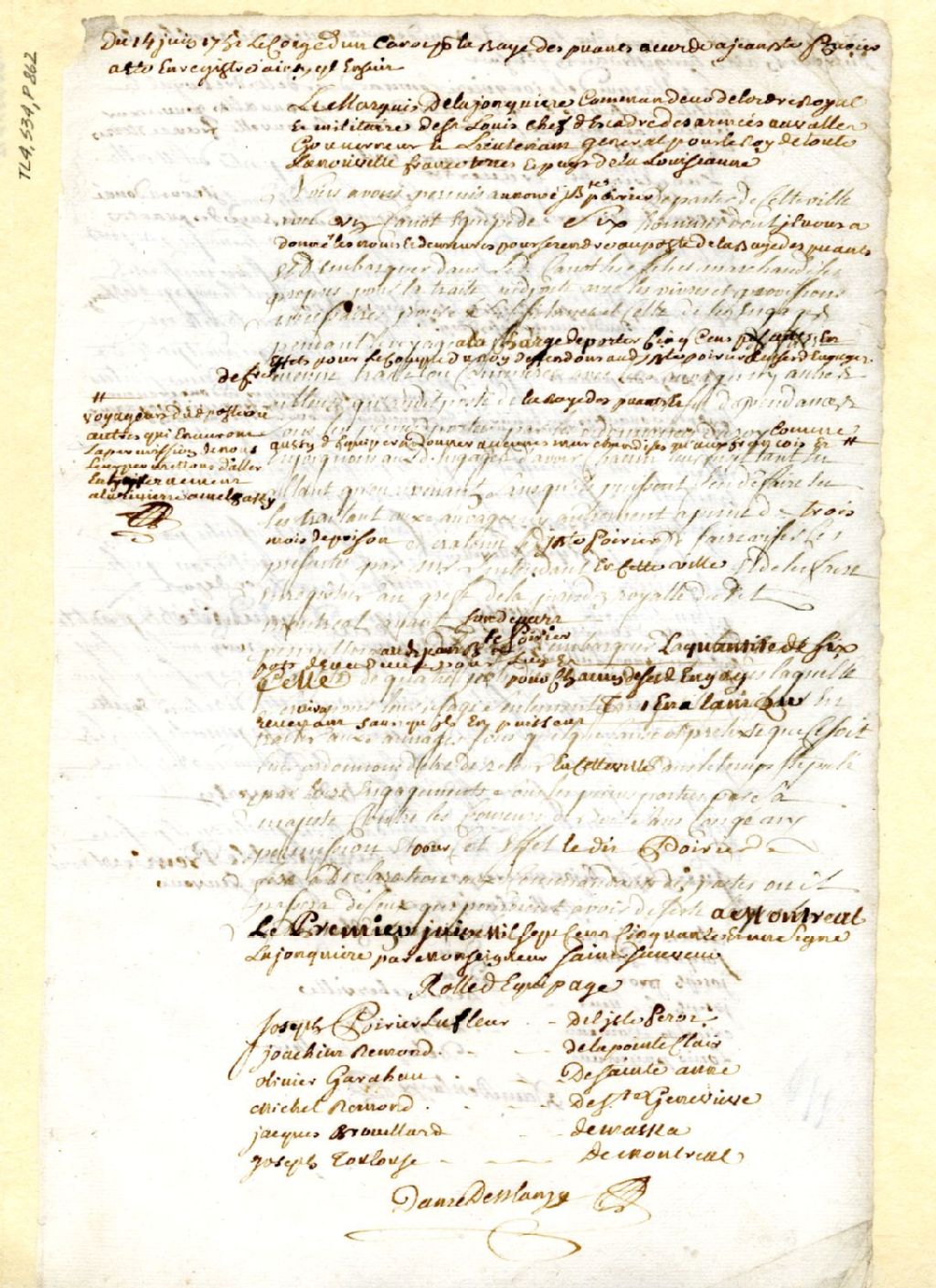 Montréal. Enregistrement d'une permission accordée par Jacques-Pierre Taffanel de la Jonquière, gouverneur de la Nouvelle-France, le 1 juin, à Jean-Baptiste Poirier, d'un canot et six hommes, pour se rendre au Poste de la Baie des Puants. [Green Bay, Wisconsin], 14 juin 1751, Archives nationales à Montréal, Fonds Juridiction royale de Montréal, (06M,TL4,S34,P862).