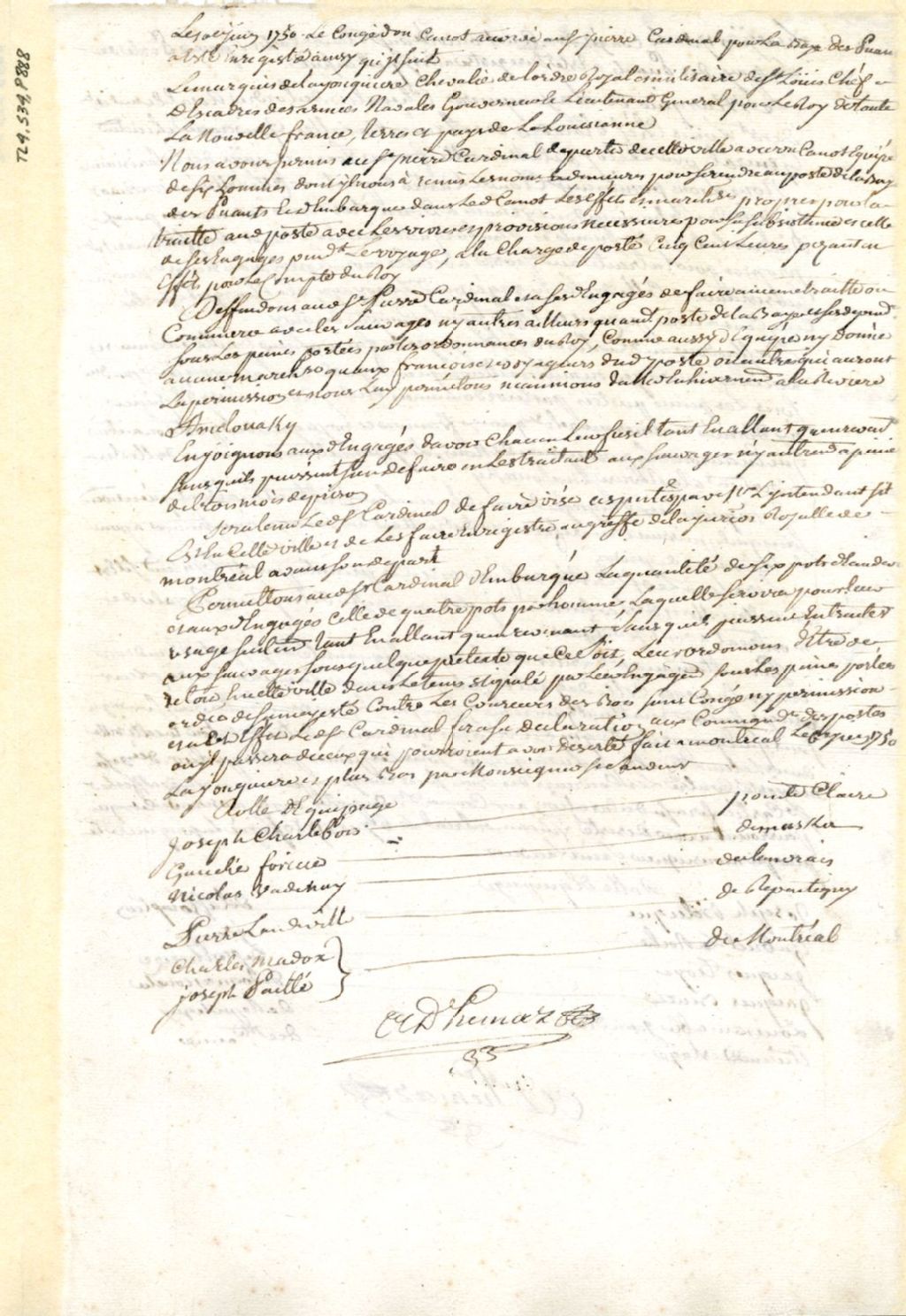 Montréal. Enregistrement d'une permission accordée par Jacques-Pierre Taffanel de la Jonquière, gouverneur de la Nouvelle-France, le 6 juin, à Pierre Cardinal, d'un canot et six hommes, pour se rendre au Poste de la Baie [Baie des Puants, Green Bay, Wisconsin]