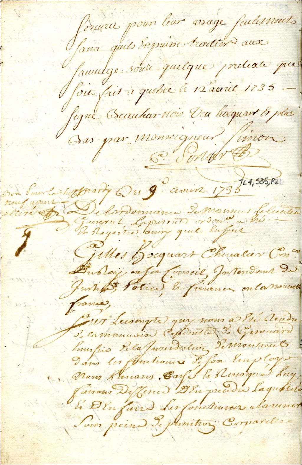 Montréal. Enregistrement de l'ordonnance de l'intendant Gilles Hocquart, du 27 juillet, qui révoque Antoine Girouard de la charge d'huissier de la juridiction royale de Montréal, 9 août 1735, Archives nationales à Montréal, Fonds Juridiction royale de Montréal, (06M,TL4,S35,P21).