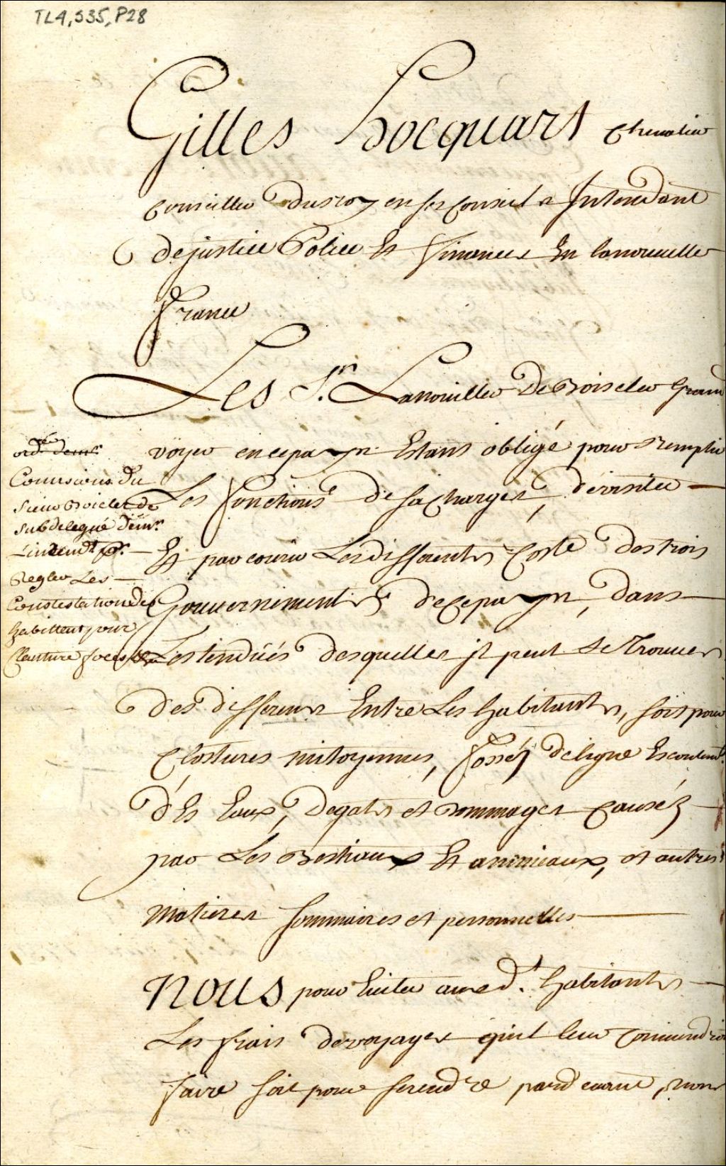Montréal. Enregistrement de l'ordonnance de l'intendant Gilles Hocquart, du 26 février, relative à la nomination de [Jean-Eustache] Lanouillier de Boisclerc comme subdélégué pour régler les contestations des habitants, 1734, Archives nationales à Montréal, Fonds Juridiction royale de Montréal, (06M,TL4,S35,P28).