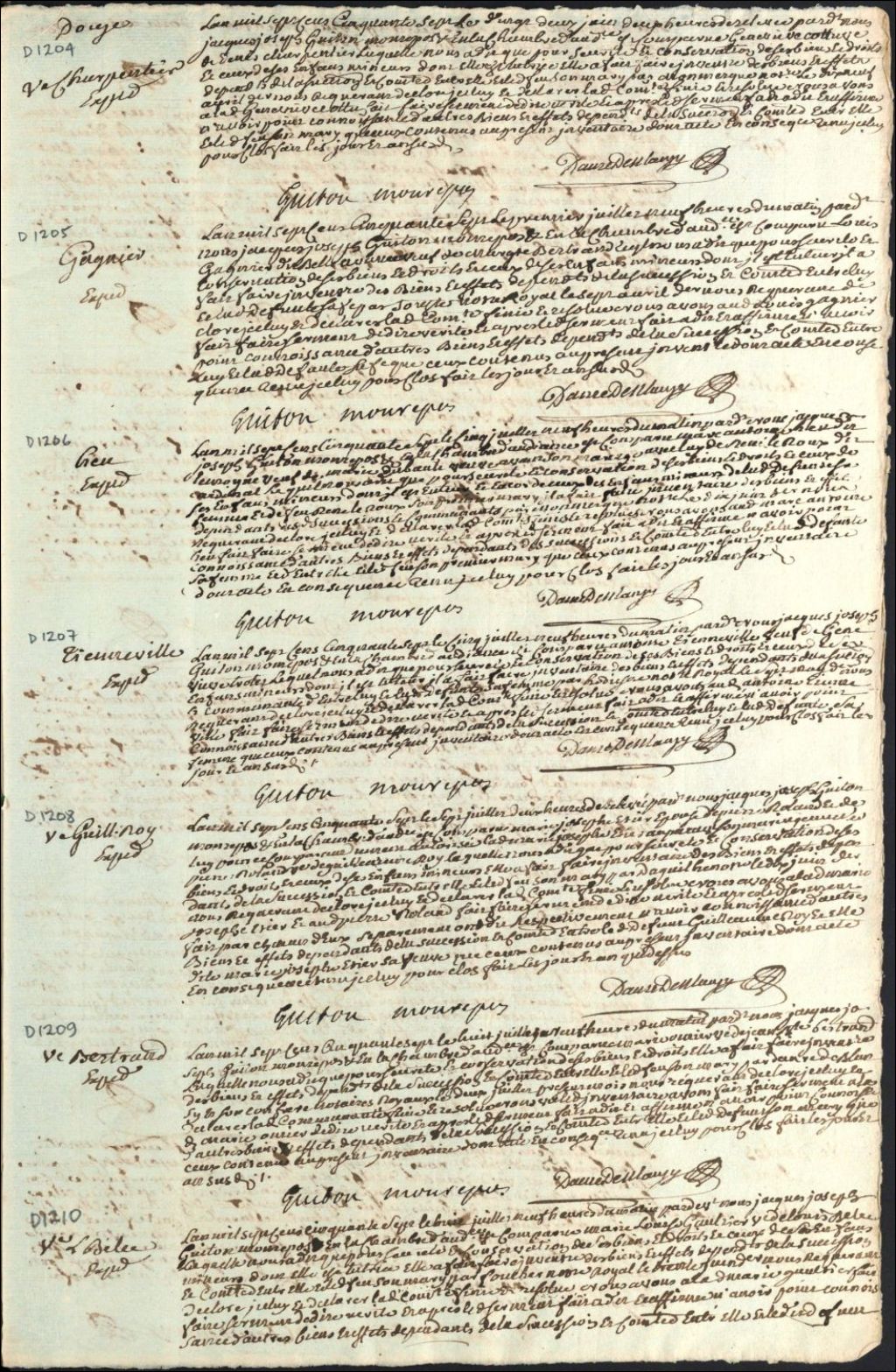 Clôture d'inventaire des biens de la succession et de la communauté de Marie-Louise Gauthier et de Louis Belec, 8 juillet 1757, Archives nationales à Montréal, Clôtures d'inventaires. District judiciaire de Montréal, (06M,CV601,S1,D1210).
