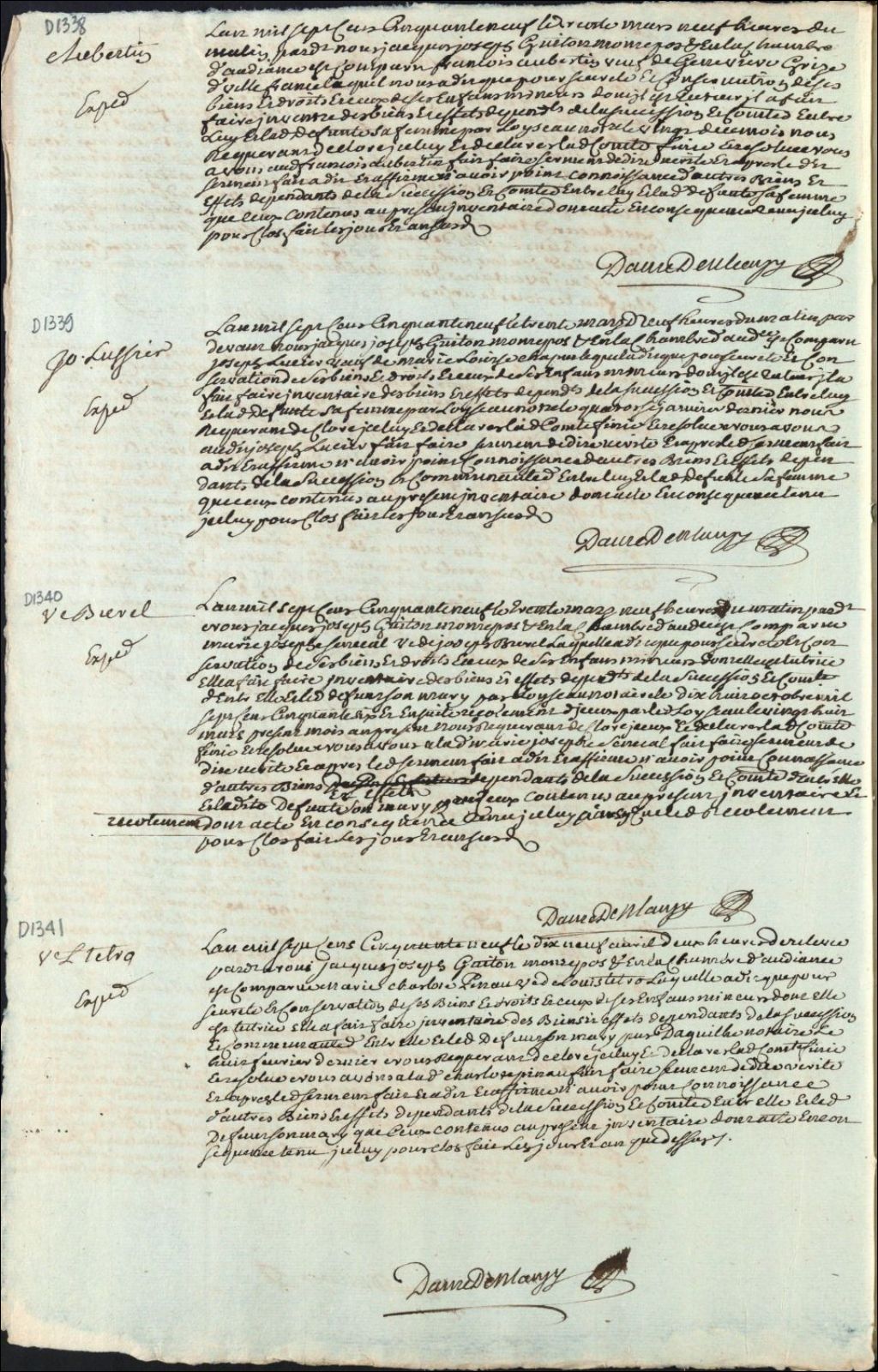 Clôture d'inventaire des biens de la succession et de la communauté de Marie-Josephe Sénécal [Laframboise] et de défunt Joseph Brunel, 30 mars 1759, Archives nationales à Montréal, Clôtures d'inventaires. District judiciaire de Montréal, (06M,CV601,S1,D1340).