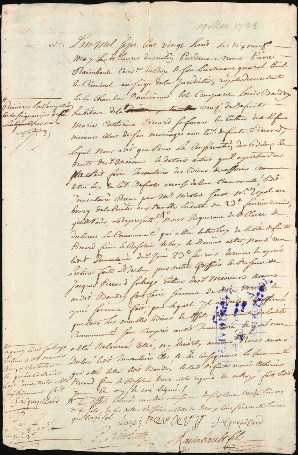Clôture d'inventaire des biens de la succession et de la communauté de Louis Beaudry et de défunte Marie Catherine Picard, 19 mai 1728, Archives nationales à Montréal, Clôtures d'inventaires. District judiciaire de Montréal, (06M,CV601,S1,D136).