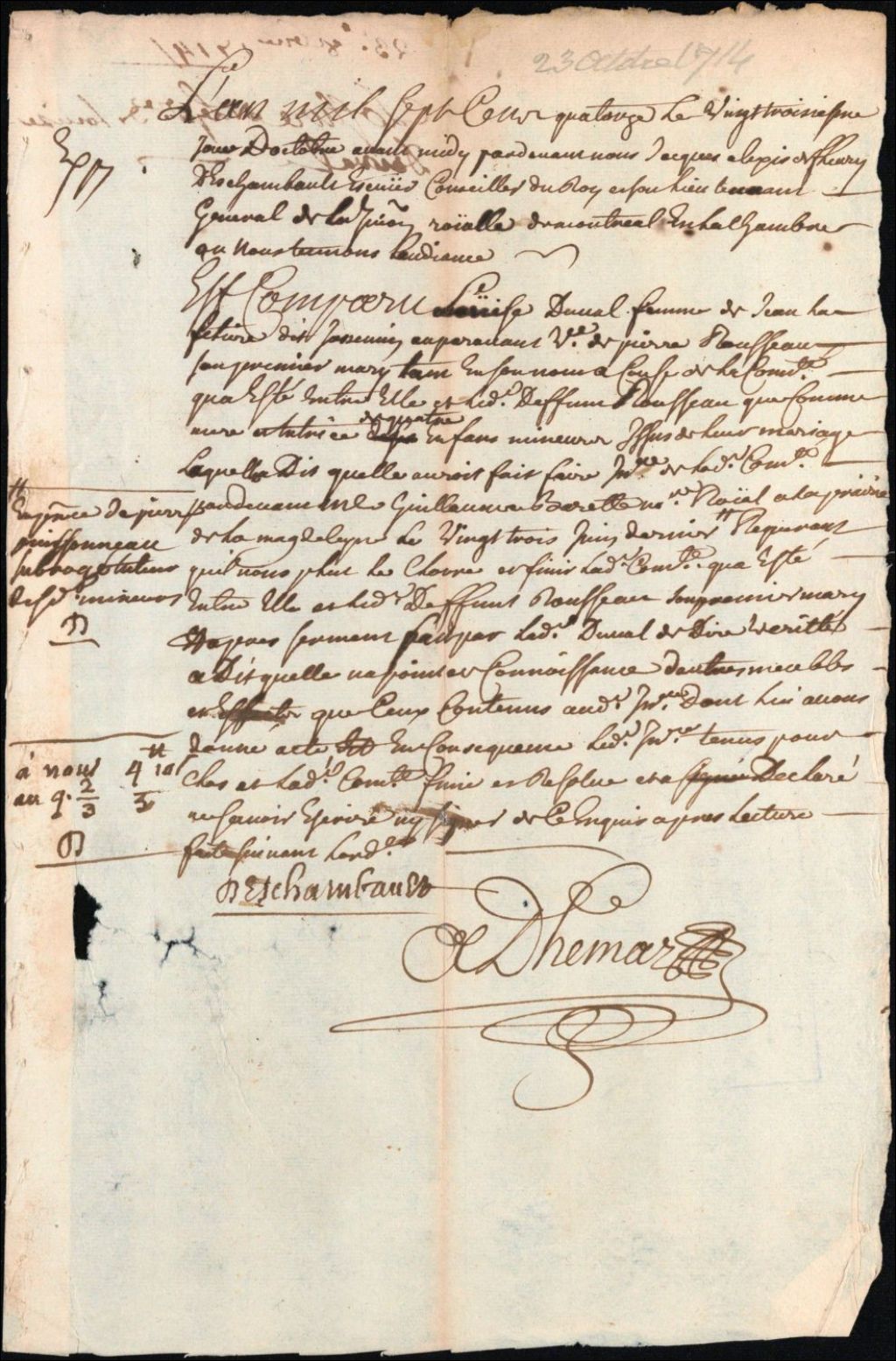 Clôture d'inventaire des biens de la succession et de la communauté de Louise Duval et de défunt Pierre Rousseau [dit Lajoie], 23 octobre 1714, Archives nationales à Montréal, Clôtures d'inventaires. District judiciaire de Montréal, (06M,CV601,S1,D20).