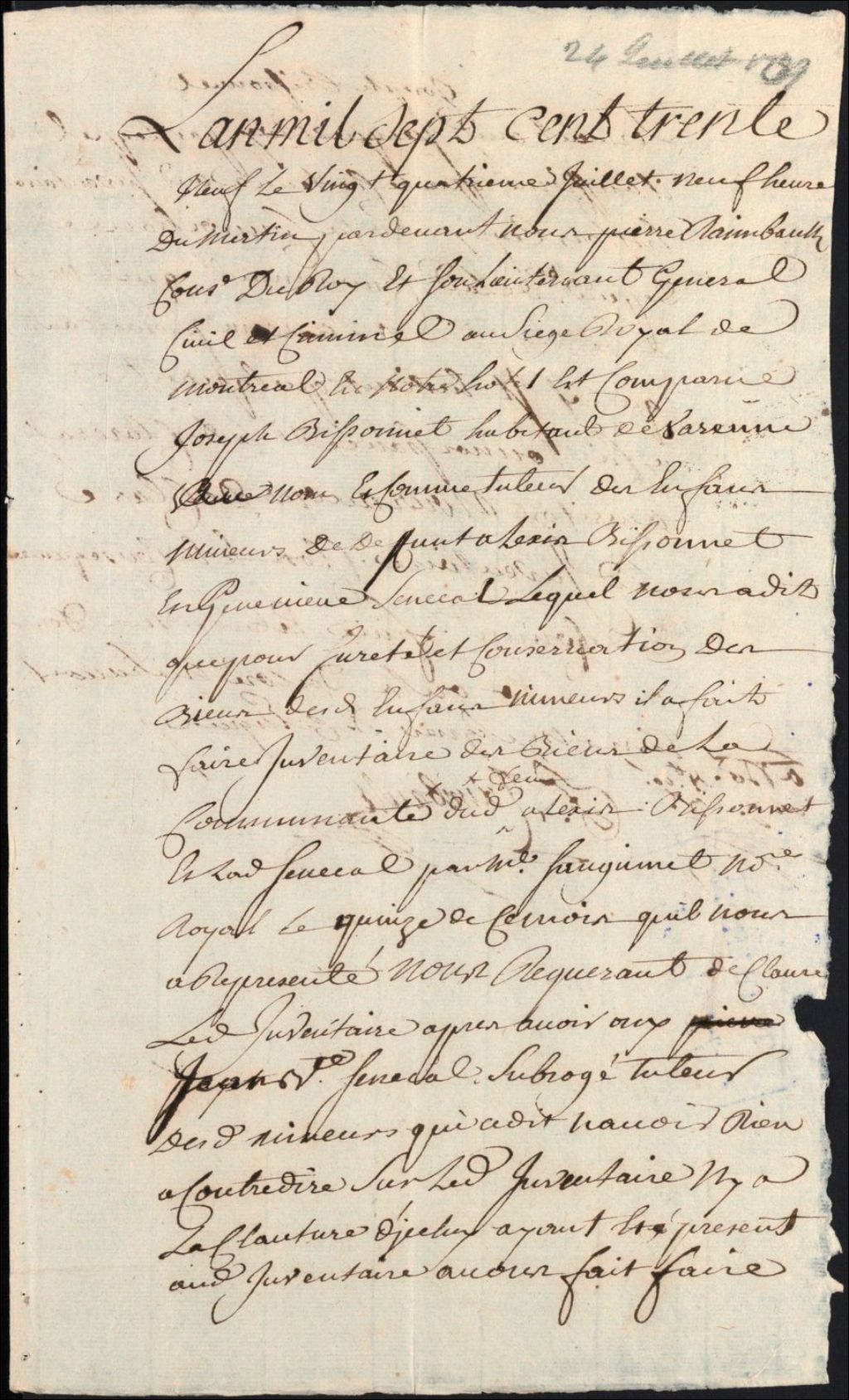 Clôture d'inventaire des biens de la succession et de la communauté des défunts Alexis Bissonnette et Geneviève Sénécal [dit Laframboise], 24 juillet 1739, Archives nationales à Montréal, Clôtures d'inventaires. District judiciaire de Montréal, (06M,CV601,S1,D379).