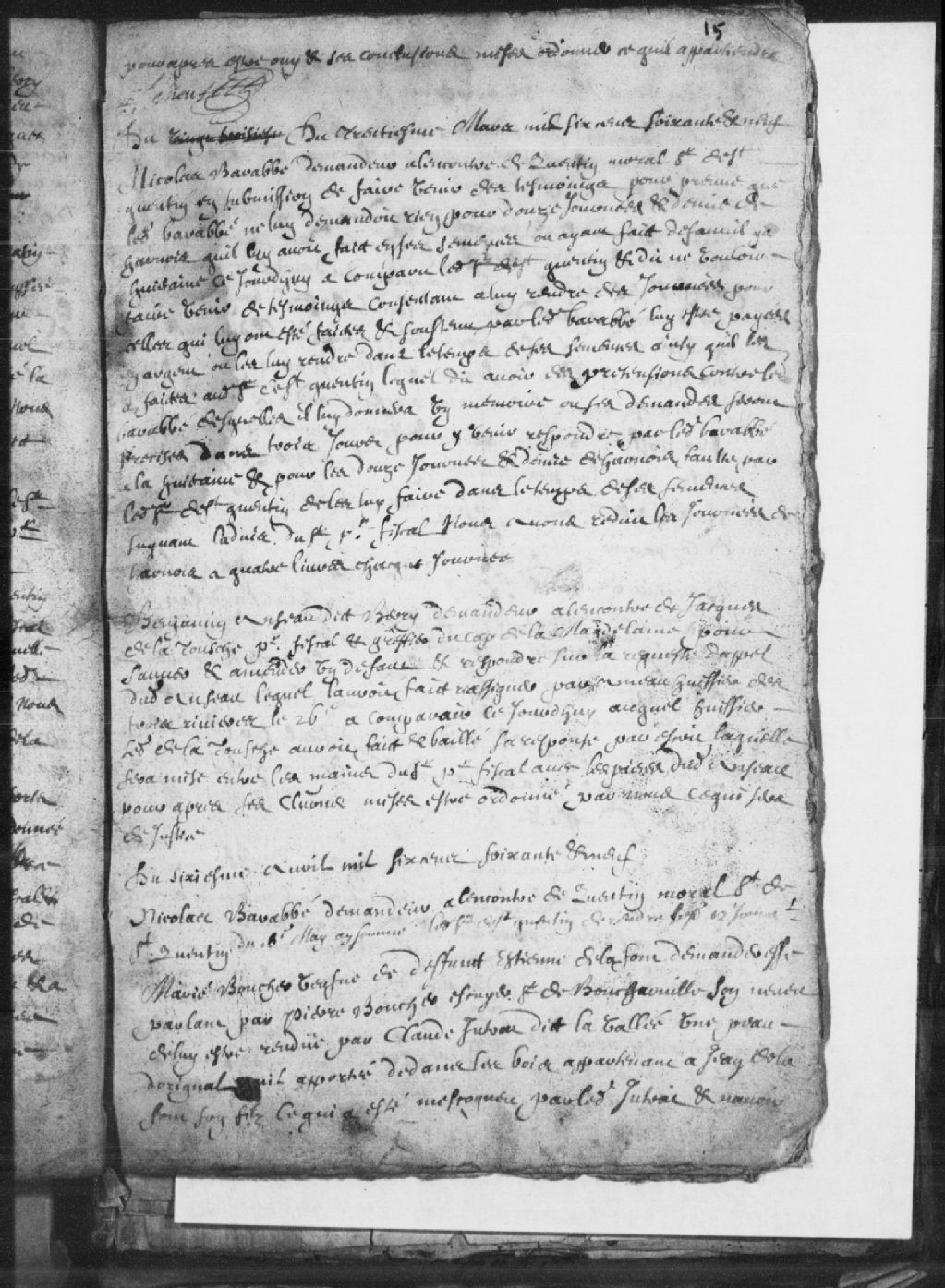 Le titre complet de la pièce se lit comme suit : Instance de Nicolas Barabé (Barabbé), demandeur, à l'encontre de Quentin Moral, sieur de Saint-Quentin, en soumission de faire venir des témoins pour prouver que ledit Barabé (Barabbé) ne lui demandait rien pour les 12 journées et demi de harnois qu'il lui a faites. Après avoir fait défaut il y a huitaine, ledit défendeur est comparu et dit ne pas vouloir faire venir de témoins et il consent à lui payer les journées qui lui ont été faites. Ledit Saint-Quentin ajoute qu'il a des prétentions contre ledit demandeur qu'il fera valoir dans 3 jours dans un mémoire dont il devra venir répondre à la huitaine. Il est ordonné audit sieur de Saint-Quentin de payer audit demandeur 4 livres par journée de harnois.