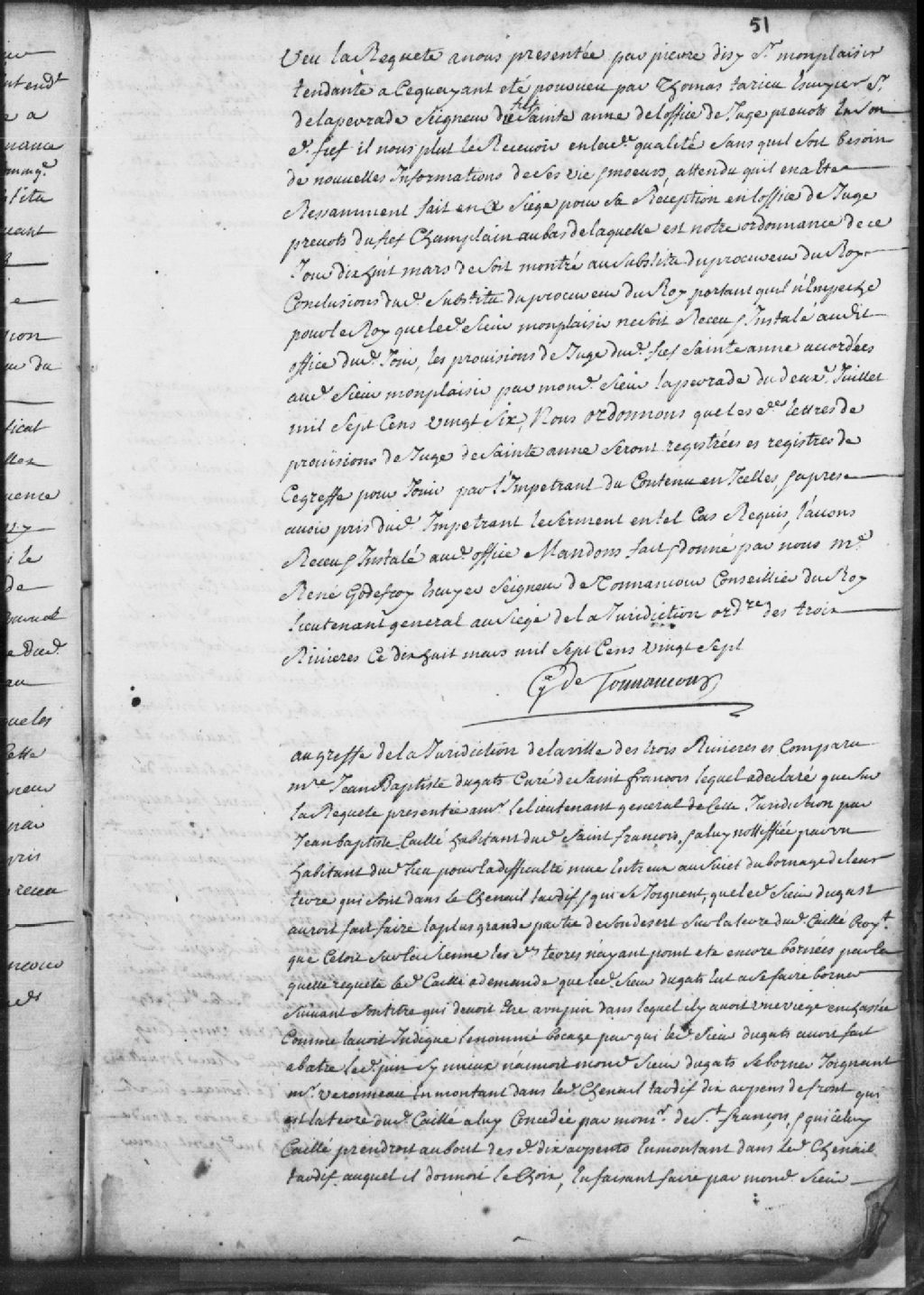 Comparution de Jean-Baptiste Dugas (Dugats), curé de Saint-François et de Jean-Baptiste Caillé, habitant dudit Saint-François. Ils comparaissent au sujet du bornage de leurs terres qui sont dans le chenail Tardif. Ledit Dugas (Dugats) aurait fait la majeure partie de son désert sur la terre dudit Caillé croyant qu'il était sur la sienne car les terres n'ont pas encore été bornées. Le sieur Dugas (Dugats) accepte de faire promesse de borner ses terres, 8 mai 1727, Archives nationales à Trois-Rivières, Fonds Juridiction royale des Trois-Rivières, (04T,TL3,S11,P1146).