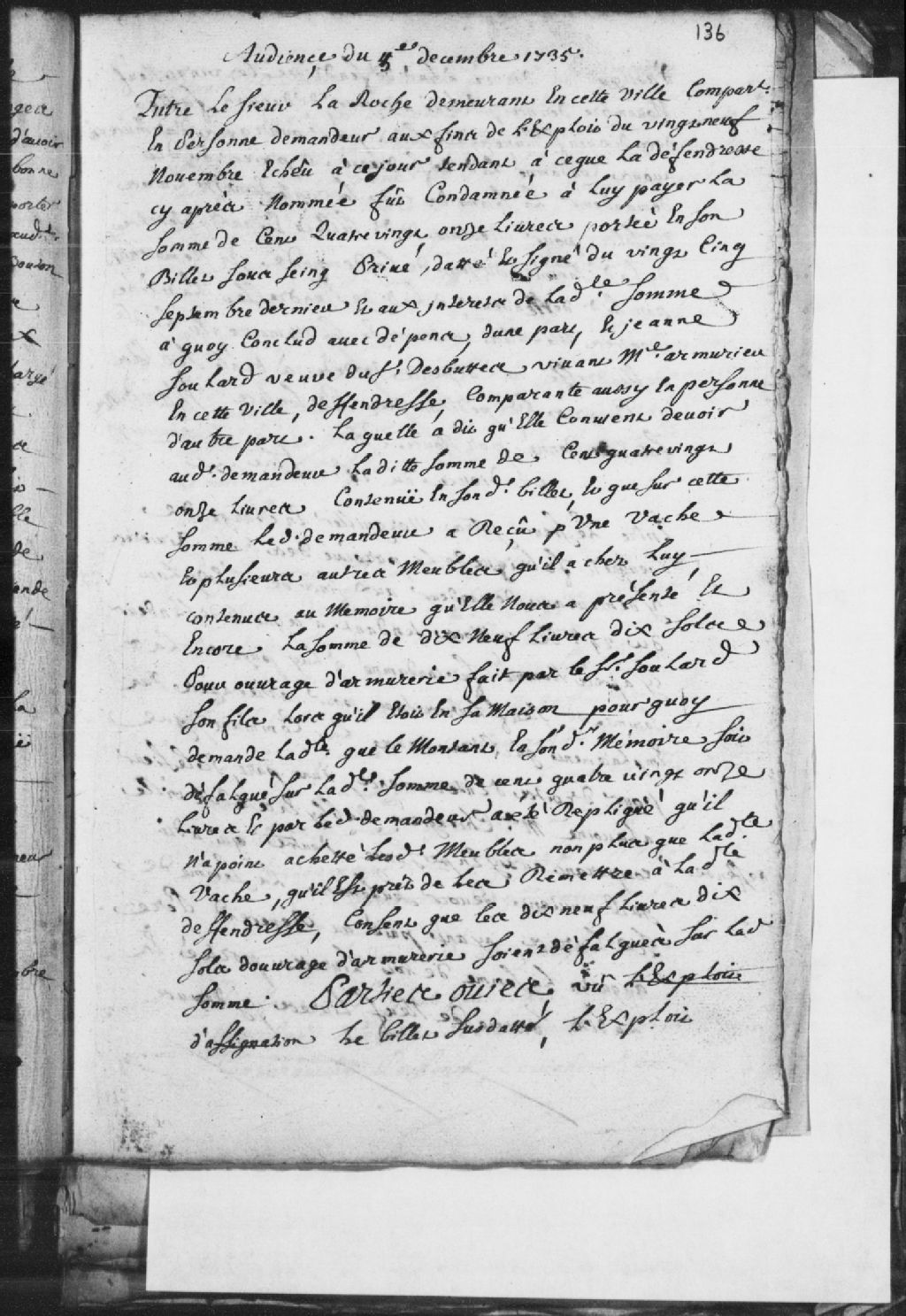 - Le titre complet de la pièce se lit comme suit : Requête du sieur La Roche (Laroche), demeurant à Trois-Rivières, demandeur, à l'encontre de Jeanne Soulard, veuve du défunt Desbuttes, vivant maître armurier de Trois-Rivières, défenderesse. Le demandeur réclame la somme de 191 livres et les intérêts portée par un billet. La défenderesse reconnaît devoir ladite somme sur laquelle ledit demandeur a reçu une vache, plusieurs meubles qu'il a chez lui et la somme de 19 livres et 10 sols pour l'ouvrage d'une armurerie faite par le sieur Soulard, son fils. Ladite défenderesse est condamnée à verser la somme de 171 livres et 10 sols ainsi que les intérêts au demandeur en plus des dépens, alors que ledit demandeur doit lui remettre la vache et lesdits meubles.