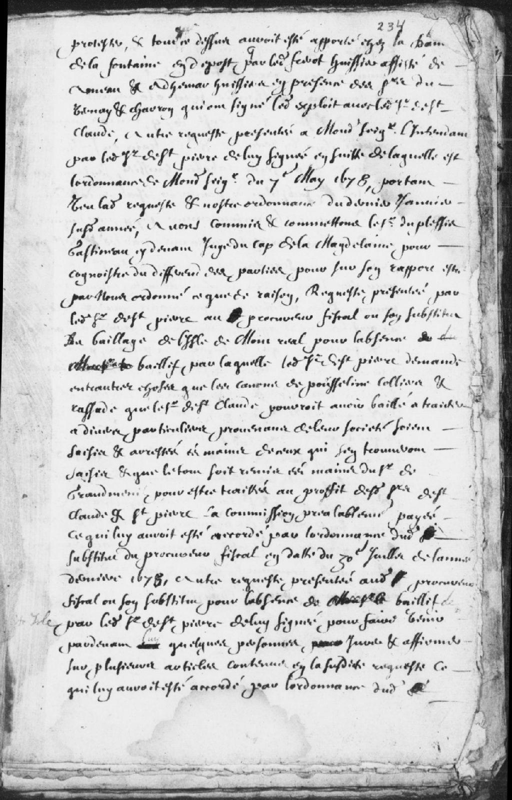 Cette cause comporte plusieurs requêtes et assignations de 1678 à 1679 et différents notaires, huissiers, procureurs et témoins dont du Plessis (Duplessis) Gastineau (Gatineau), Frérot, Adhémar, Cabassier (Cabazier), Grandmesnil (Grandménil), du Vernay (Duvernay), Charron (Charon) et la dame de la Fontaine (Lafontaine)