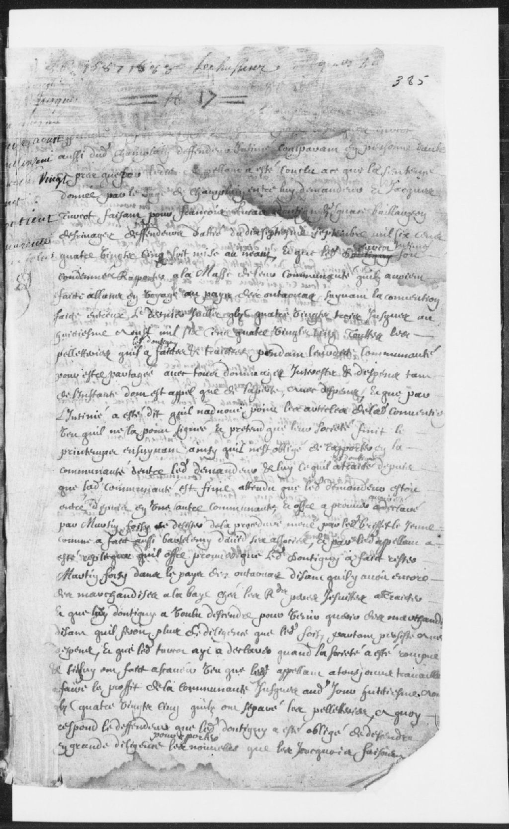 - Le titre complet de la pièce se lit comme suit : Appel de sentence de Jacques Brisset, demeurant à Champlain, demandeur, contre Jacques Turcot, faisant pour François Lucas dit Dontigny et Ignace Baillargeon, défendeur et intimé, à la suite de la sentence du juge de Champlain, datée du 17 septembre 1685, pour qu'elle soit mise au néant et pour que le défendeur soit tenu de rapporter les profits de la traite à leur communauté, suivant une convention passée entre eux, du 31 juillet 1683 au 8 août 1685 à Sault-Sainte-Marie; le défendeur dit qu'il n'a pas signé ladite convention et que les activités de la société ont cessé au printemps; ledit Turcot est condamné à rapporter tous les profits de la communauté pour être partagés et à payer les dépens liquidés à 100 sols, y compris l'expédition de la sentence, signé Bourbaux (Bourbeau).Sont aussi présents ses associés Martin Foisy et Barthélemy David et le Révérend Père Jésuite.