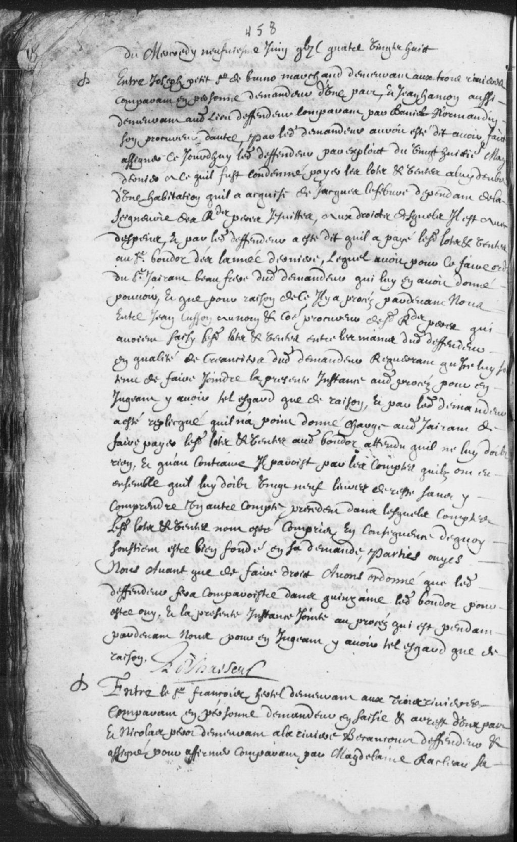 - Le titre complet de la pièce se lit comme suit : Requête de sieur François Hertel, demeurant aux Trois-Rivières, demandeur en saisie et arrêt, contre Nicolas Perot (Perraut, Perrault), demeurant à la rivière Batiscan, défendeur et assigné pour affirmer, comparant par Madeleine Racleau (Raclos), sa femme, concernant son dû envers la succession de feu Claude David, d'une ferme pour laquelle ladite succession en est le créancier; il est ordonné que le défendeur comptera avec Pierre Couillard, tuteur des enfants mineurs du défunt, pour reconnaître ce qu'il doit à la succession, et ce, dans 15 jours, signé le Chasseur (Lechasseur).