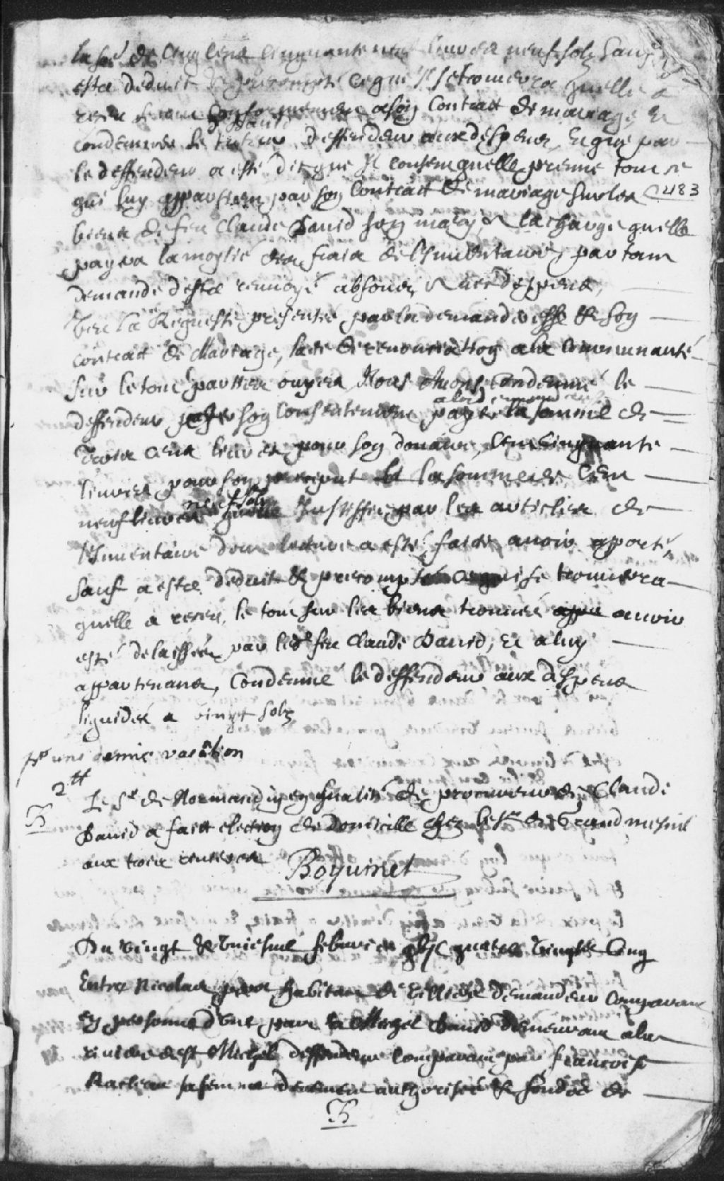 - Le titre complet de la pièce se lit comme suit : Appel de sentence à la suite de la requête du 2 janvier dernier de Nicolas Perot (Perrot, Perrault), habitant de Villiers, demandeur, contre Michel David, demeurant à la rivière Saint-Michel, défendeur, comparant par Françoise Racleau (Raclos), sa femme, défendeur, car il n'avait pas pu se défendre; il est ordonné que la sentence soit exécutée selon sa forme et teneur, ordonnant audit Perot de délivrer la moitié des grains qui se trouvent dans la grange de feu Vinçonneau à Michel David et il est condamné aux dépens liquidés à 4 livres et 10 sols.Une requête opposant Jacques du Gay (Duguay), chirurgien, comparant par Jeanne Baudry (Beaudry), sa femme, contre Claude David, comparant par Normandin, a été raturée à la page 485 et, un début de défaut, accordé à Nicolas de la rivière Saint-Michel, a été également raturé à la page 486.