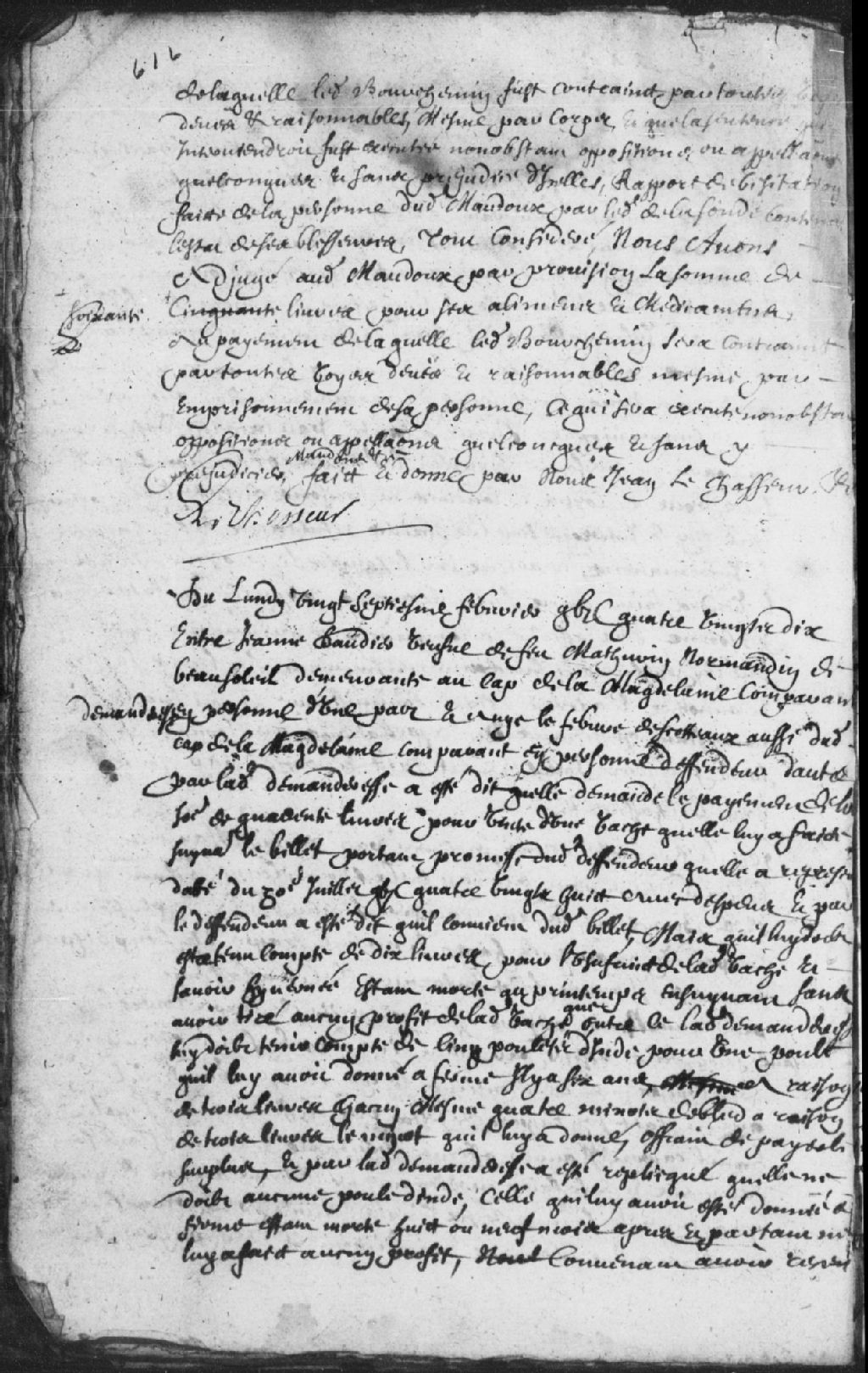 Le titre complet de la pièce se lit comme suit : Requête d'Aubin Maudoux (Maudou), habitant demeurant au Cap-de-la-Madeleine, contre le sieur de Bourchemin (Dubourchemin), pour l'avoir dangereusement blessé de plusieurs coups de manche de hache et même d'un coup d'épée à la tête; à la suite du rapport de l'état des blessures de Gilles Diee (Die) dit de la Sonde (Lasonde), chirurgien de la Compagnie de monsieur le chevalier de Vaudreuil, avons adjugé audit Maudoux la somme de 60 livres pour des aliments et médicaments payés par ledit Bourchemin ou il sera contraint d'emprisonnement, signé le Chasseur (Lechasseur).