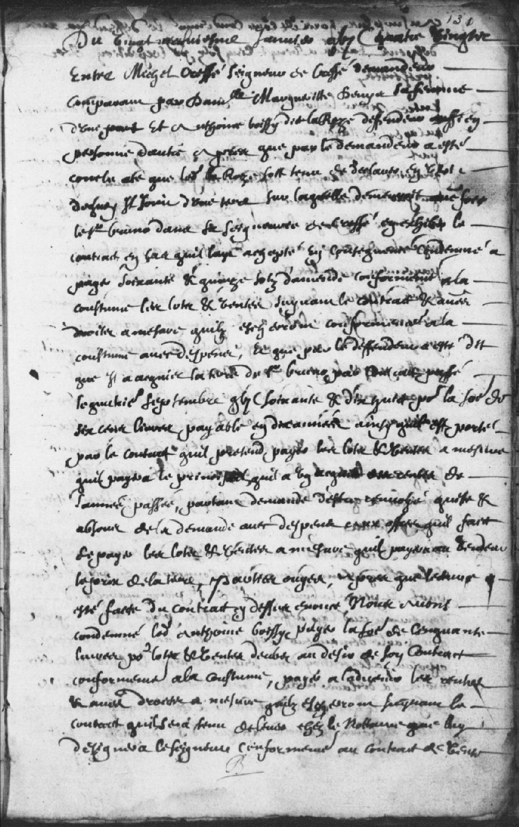 Le titre complet de la pièce se lit comme suit : Requête de Michel Cressé sieur de Cressé, demandeur, comparant par damoiselle Marguerite Denys (Deny), sa femme, contre Antoine Boissy dit Larose, défendeur, pour qu'il déclare en vertu de quoi il jouit d'une terre, sur laquelle demeurait autrefois le sieur Bruno (Bruneau), dans sa seigneurie de Cressé, qu'il en exhibe le contrat de vente et que, si il en détient un, il soit condamné à payer une amende, conformément à la coutume, lequel a affirmé avoir acquit la terre du sieur Bruno par contrat passé le 8 septembre 1678, pour la somme de 600 livres payable sur une période de 10 ans, et qu'il s'acquittera des lots et ventes à mesure qu'il payera le principal, ordonné que ledit Antoine Boissy soit condamné à payer la somme de 50 livres pour lots et ventes dus, tel que porté dans le contrat, plus les dépens taxés à 25 sols.